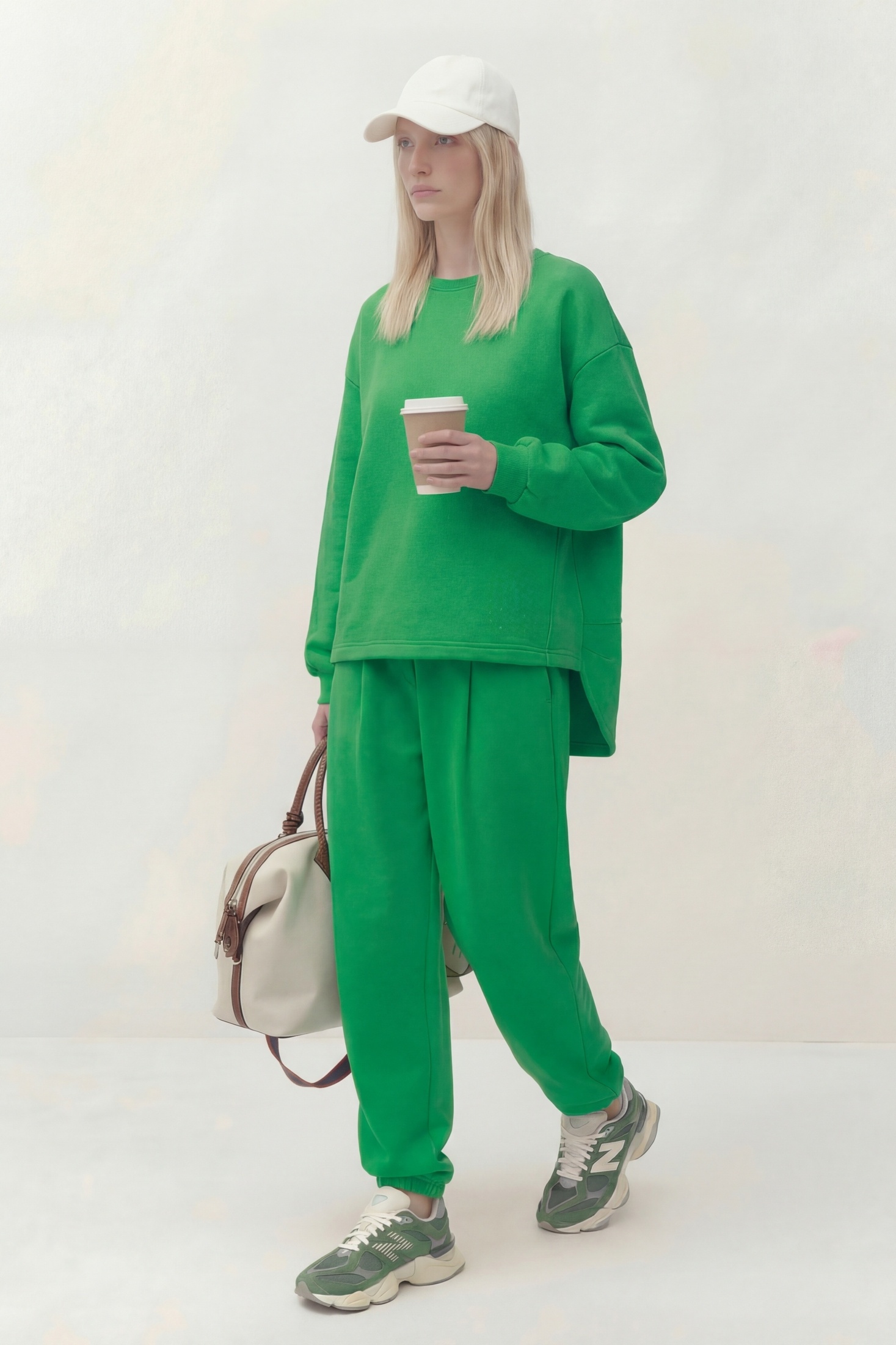 Костюм брючный 1870 Lokka предлагает комфорт и стиль в одной модели. Коллекция бренда Lokka выполнена из трикотажного футера, что обеспечивает мягкость и свободу движений. Джемпер имеет свободный крой с длиной по спинке 76 см и асимметричным низом, дополненный спущенным рукавом длиной 50 см. Ключевые детали включают притачную манжету и пришивную нашивку. Брюки заужены к низу, имеют длину 104 см и оснащены резинкой по задней части пояса для дополнительного комфорта. Карманы в боковых швах добавляют практичности. Ярко-зеленый цвет костюма привнесет свежесть в ваш гардероб. Идеально подходит для повседневного ношения в теплое время года.