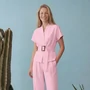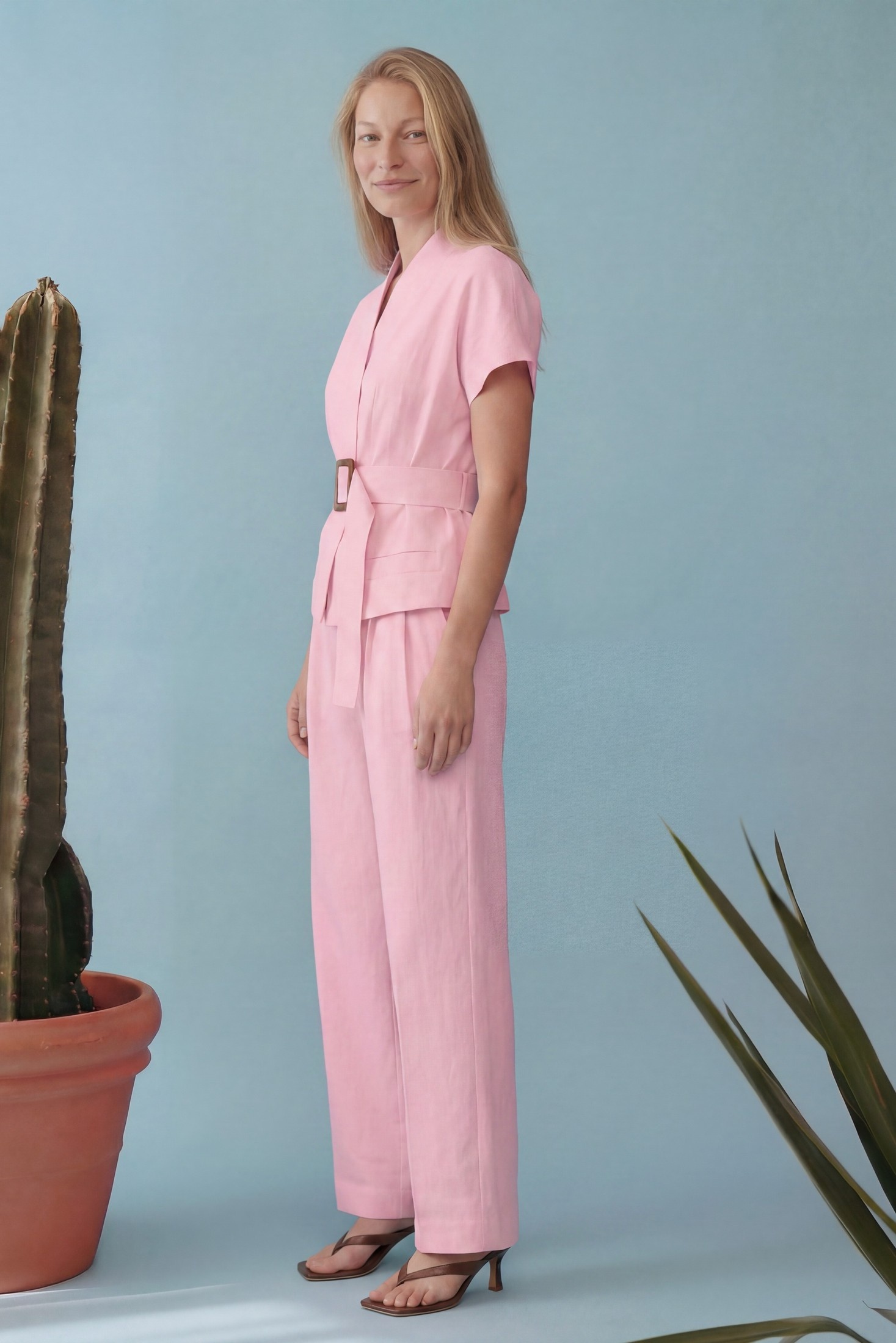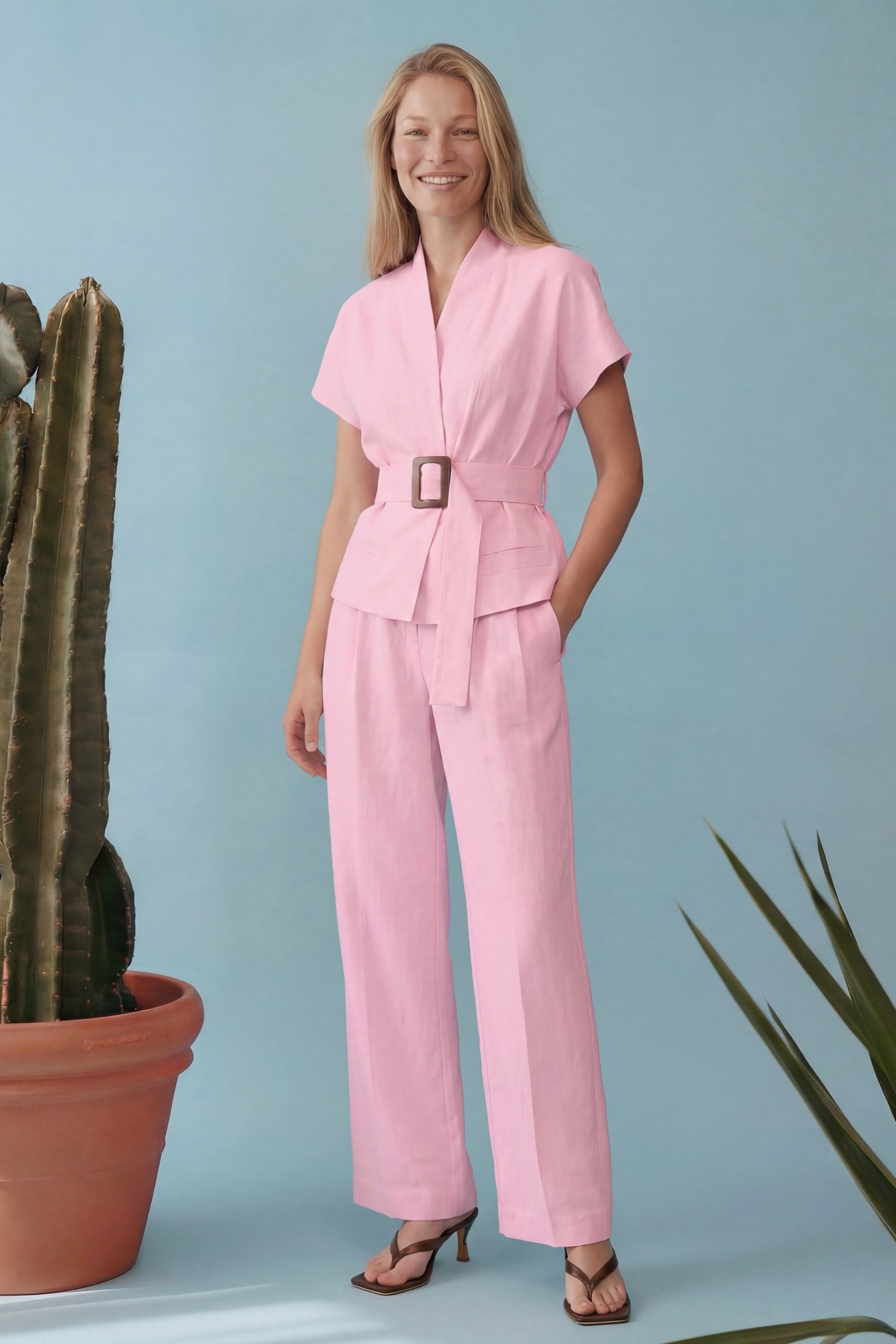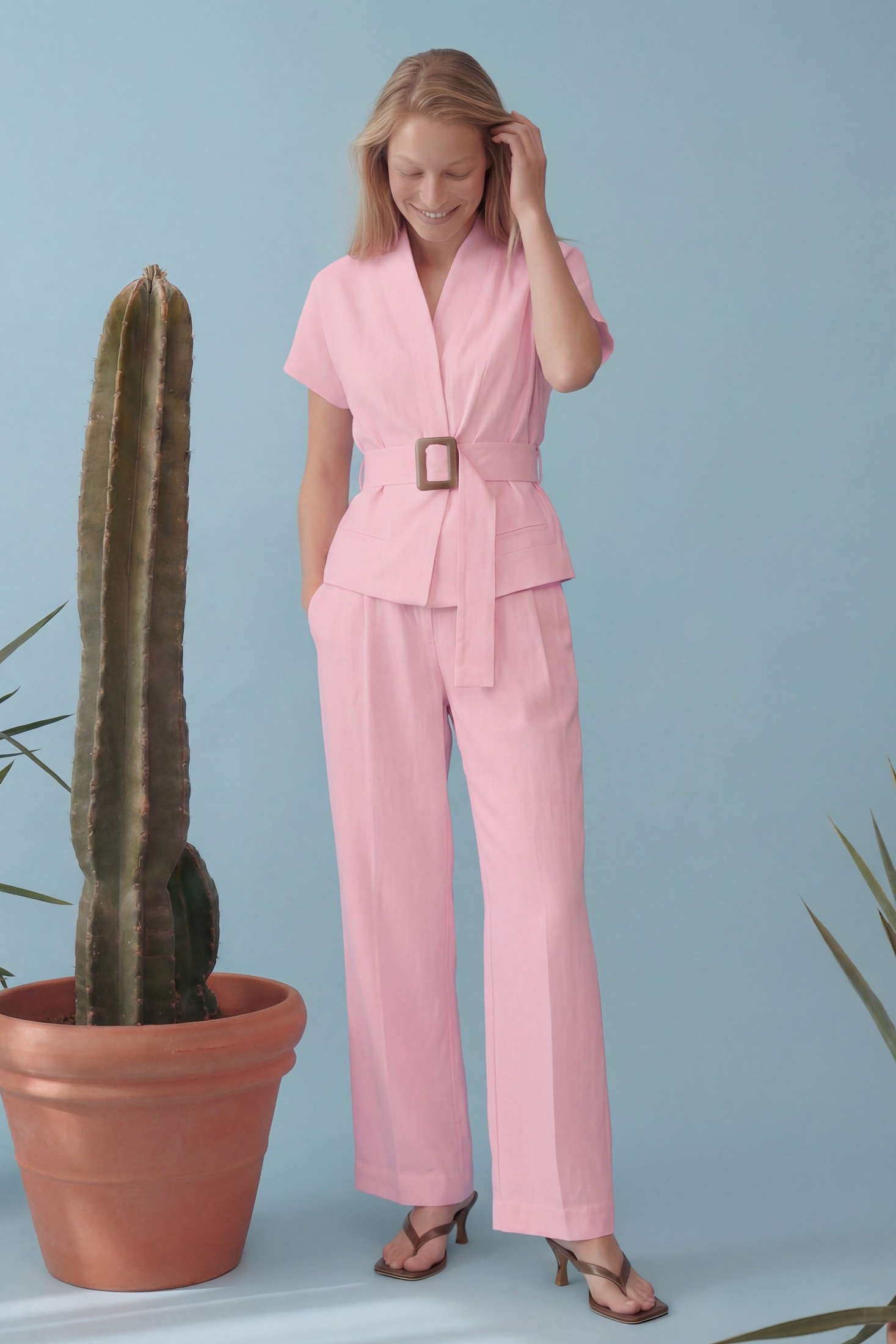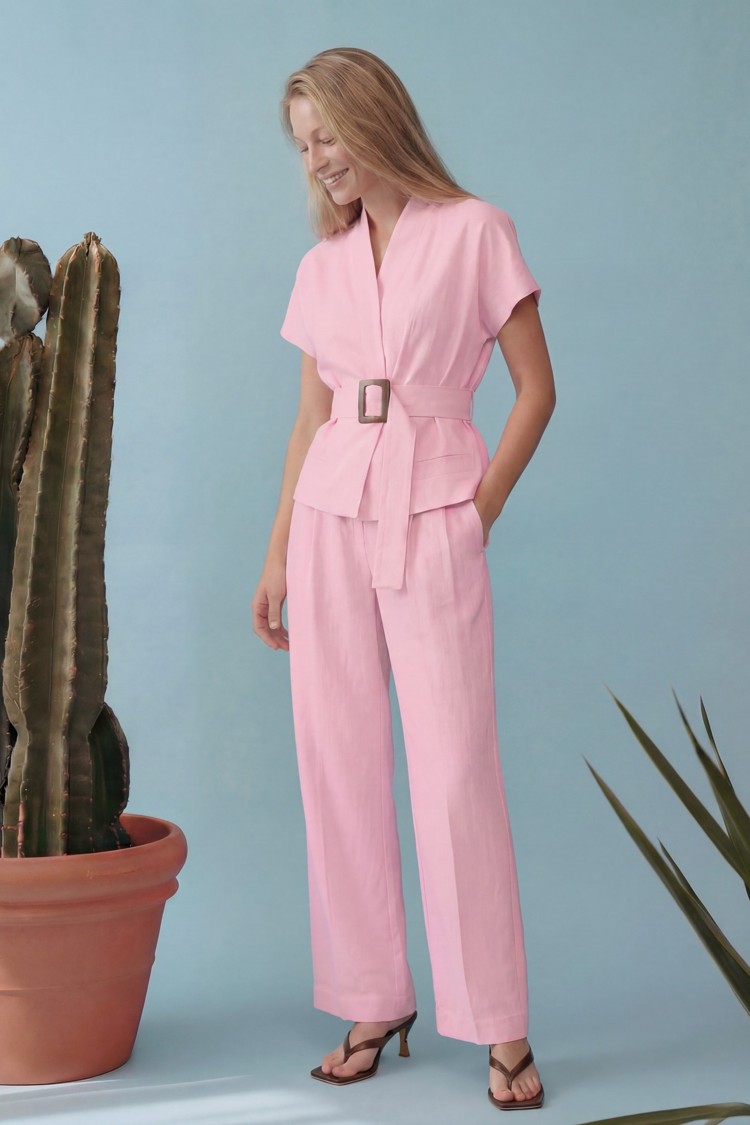Костюм брючный 1891Р розовый Lokka станет прекрасным дополнением вашего гардероба. Коллекция бренда Lokka предлагает уникальное сочетание стиля и комфорта. Изготовленный из лёгкого льна и вискозы, этот костюм идеально подходит для летнего сезона. Полуприлегающий жакет с коротким цельнокроеным рукавом создаёт плавные линии и свободный силуэт. Особенностью является скрытая застёжка на потайные кнопки и декоративные карманы-листочки. Прямые брюки оснащены мягкими складками и удобным поясом на резинке, завершённым широкой пряжкой. Розовый цвет добавляет свежести и нежности, делая костюм универсальным для различных мероприятий. Длина жакета по спинке составляет 56 см, а длина брюк с учётом пояса — 102,5 см.