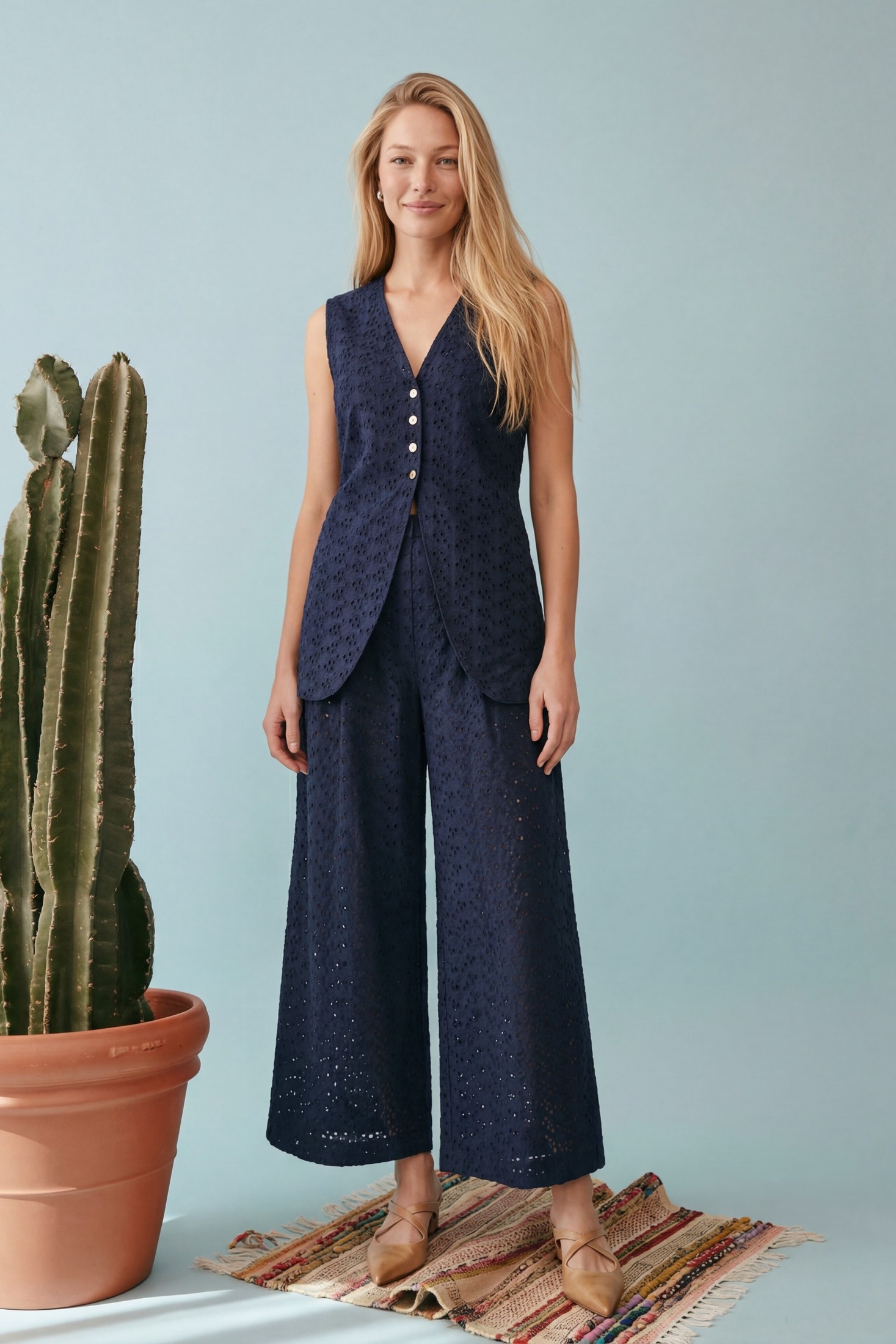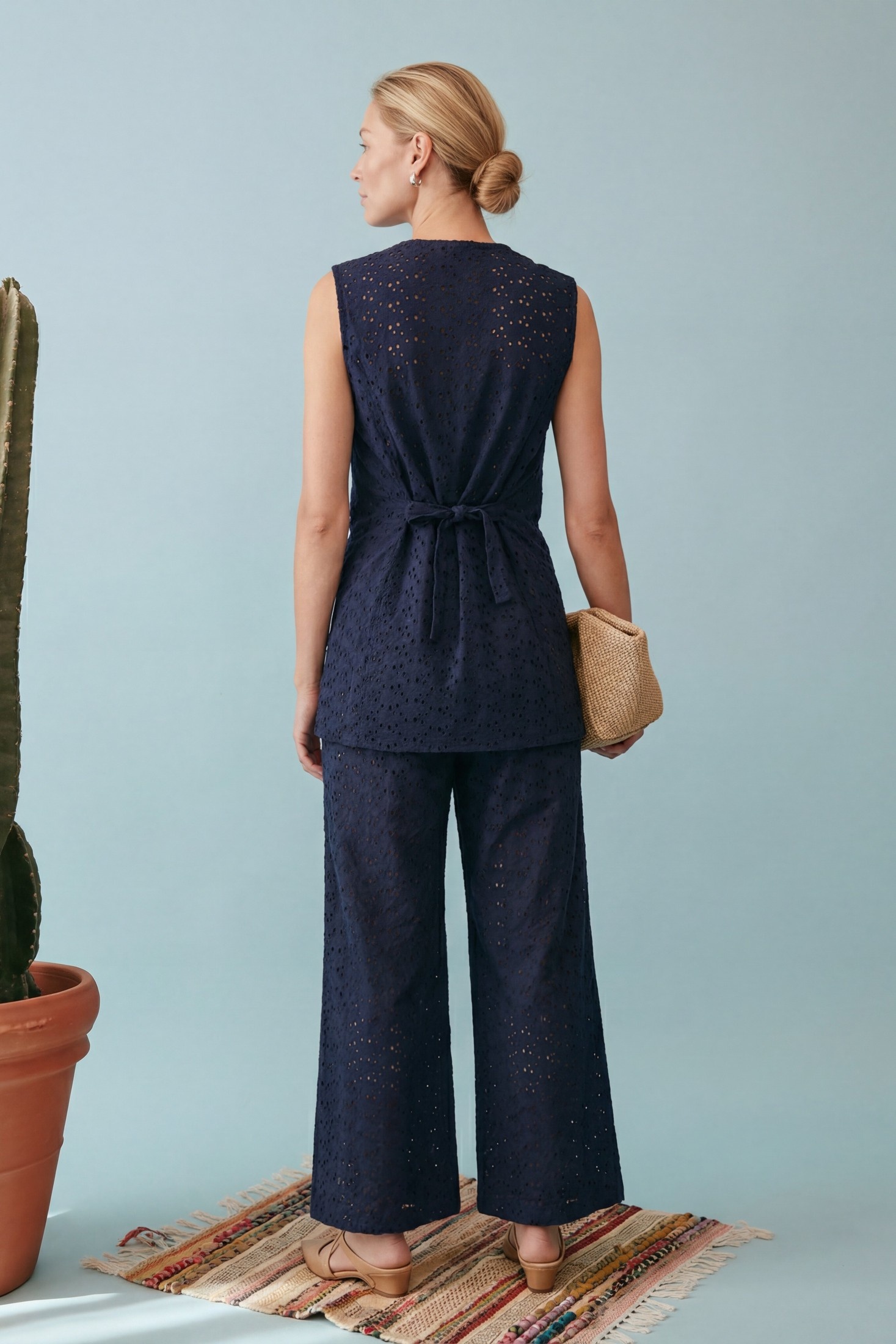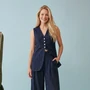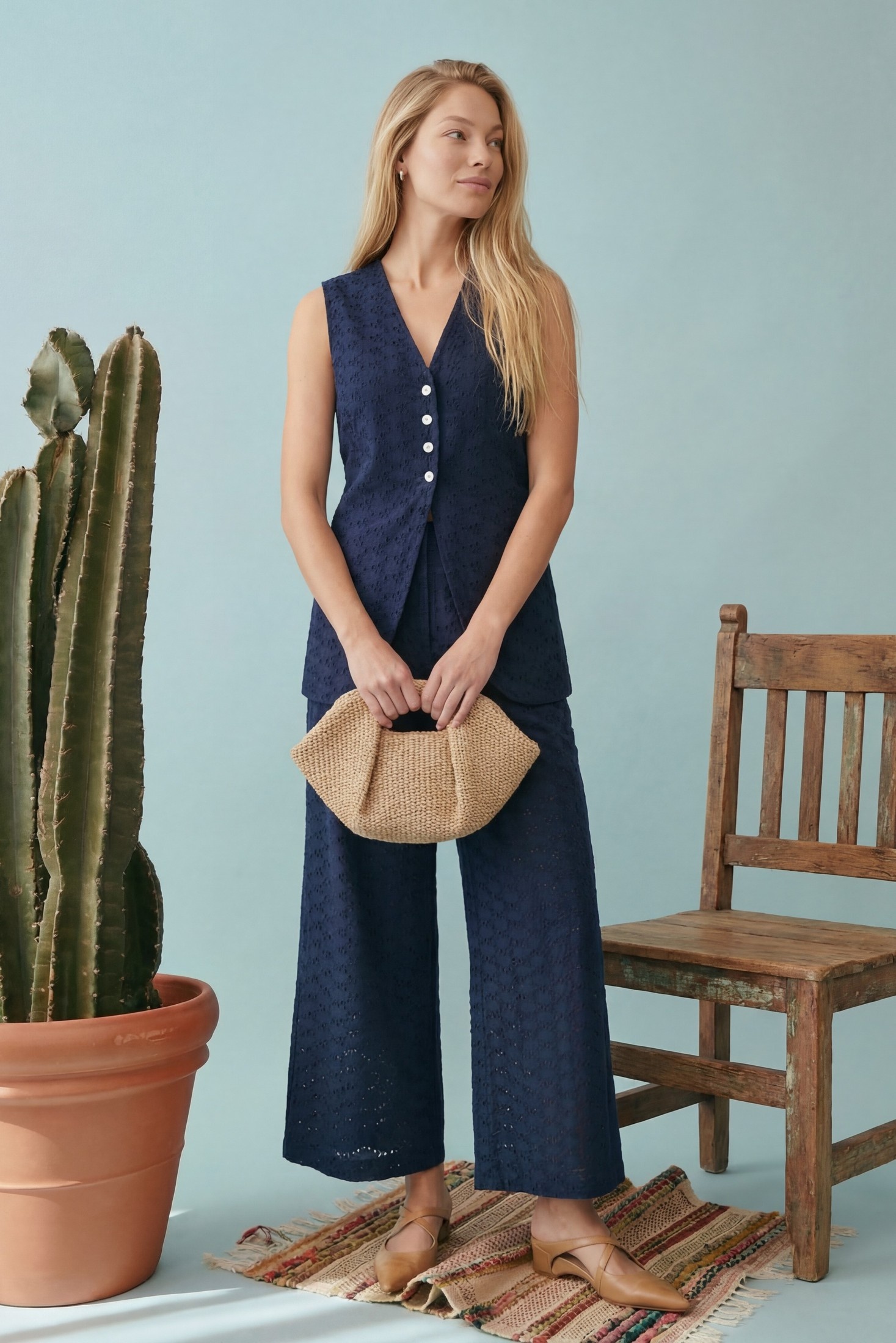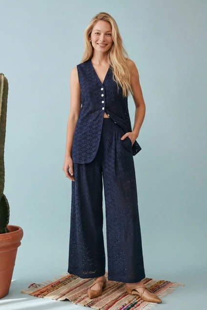 Костюм брючный 1908 глубокий темно-синий Lokka воплощает в себе идеальный баланс современного этнического и курортного стиля. Коллекция бренда Lokka предлагает этот летний комплект из 100% хлопка с вышивкой ришелье, который обеспечивает комфорт и привлекательный внешний вид. Удлиненный жилет приталенного силуэта с глубоким V-образным вырезом и застежкой на пуговицы гармонично сочетается с широкими брюками свободного кроя. Для удобства и функциональности предусмотрены боковые карманы. Жилет длиной 72 см выполнен на подкладке, закрывающей линию бедер, и снабжен завязками на талии для идеальной посадки. Брюки с длиной 102,5 см имеют частичную подкладку и пояс с мягкими складками, что придает дополнительный объем и свободу движений. Этот костюм насыщенного темно-синего цвета идеален для летних прогулок и вечеринок.