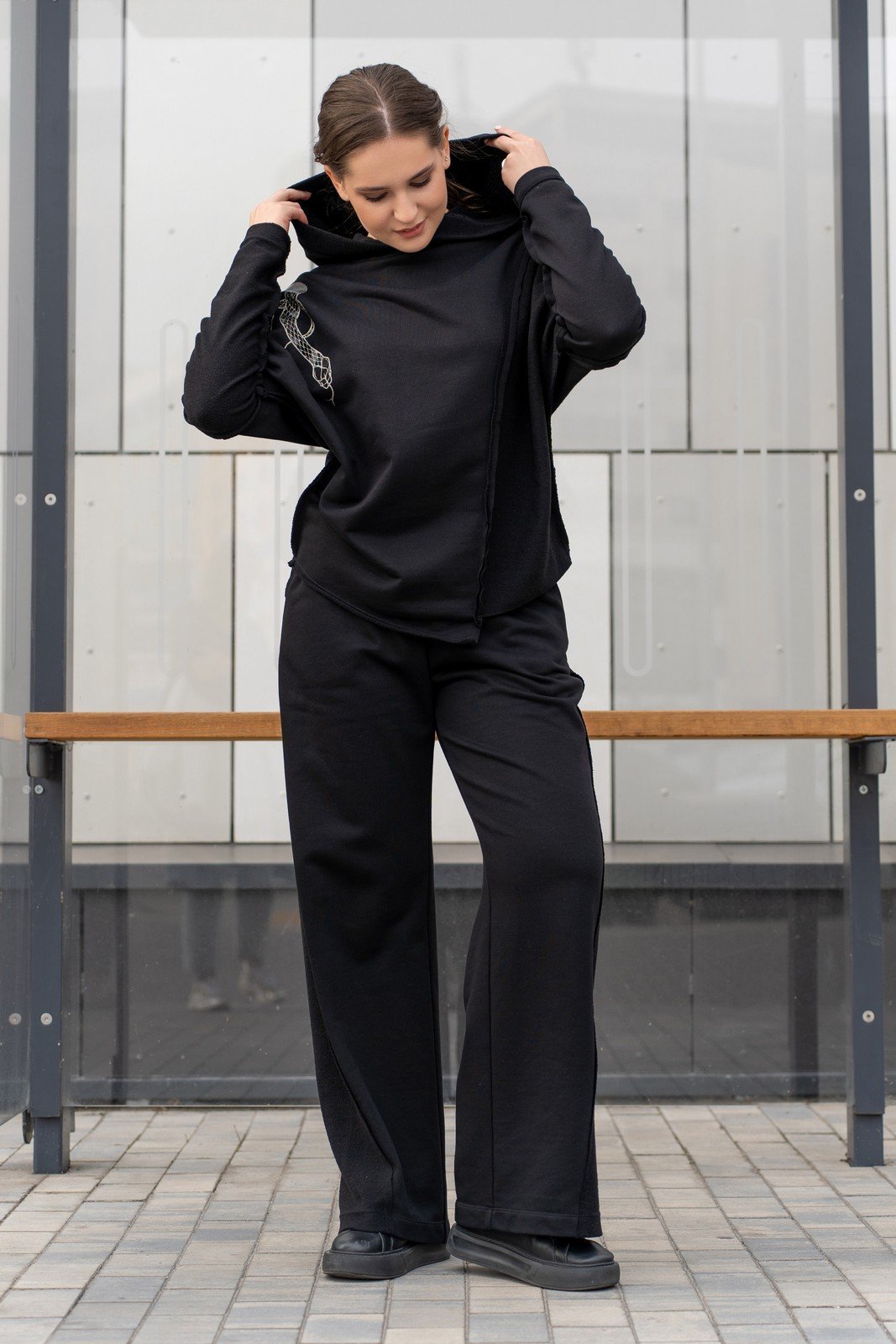 Костюм(свитшот и брюки) из плотного трикотажного футерованного полотна.Свитшот свободного ассиметричного кроя с капюшоном с комбинацией лица и изнанки ткани,с печатью на полочке.Брюки прямые высокой посадки на притачном поясе на резинке,с карманами в швах. длина свитшота-67 см