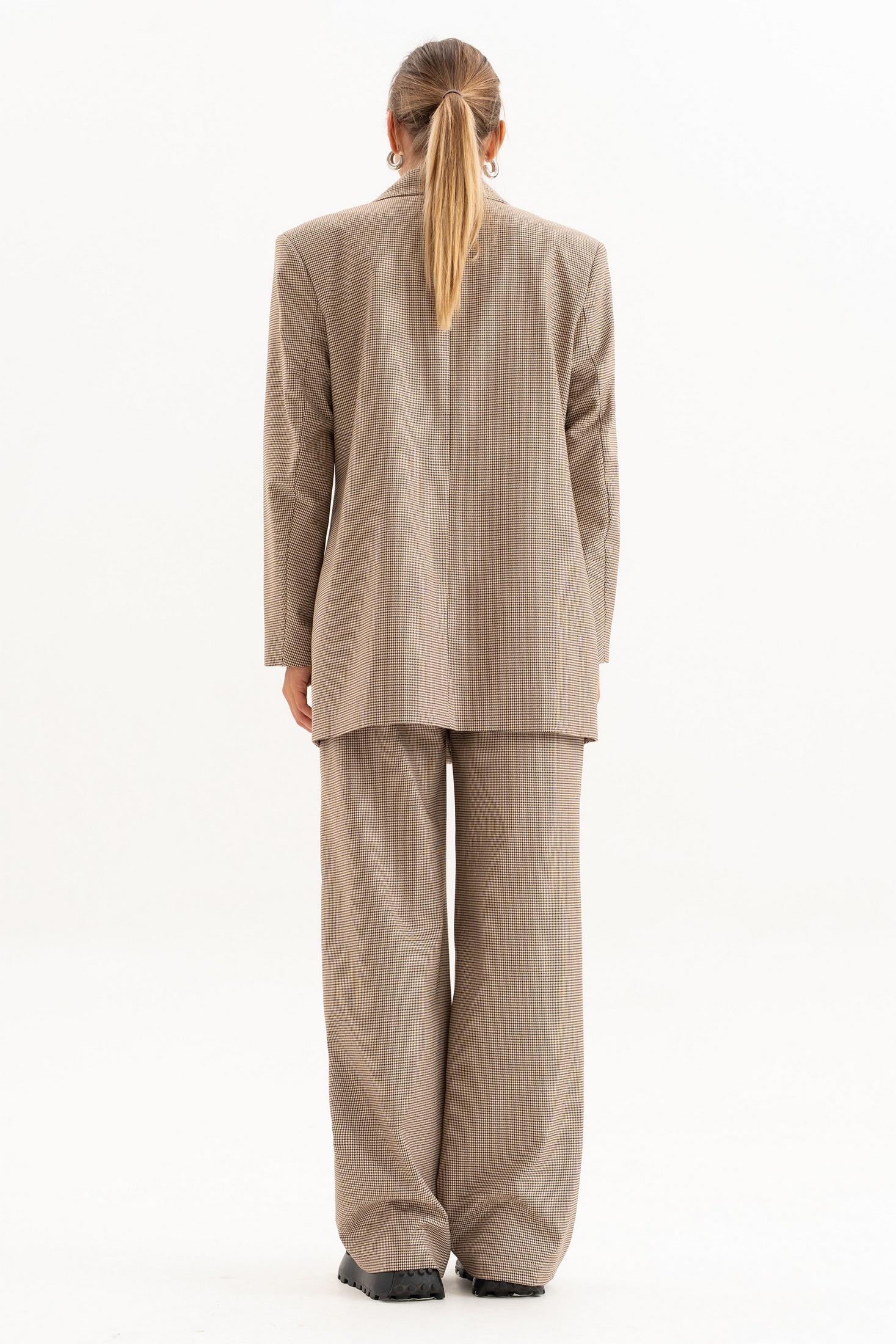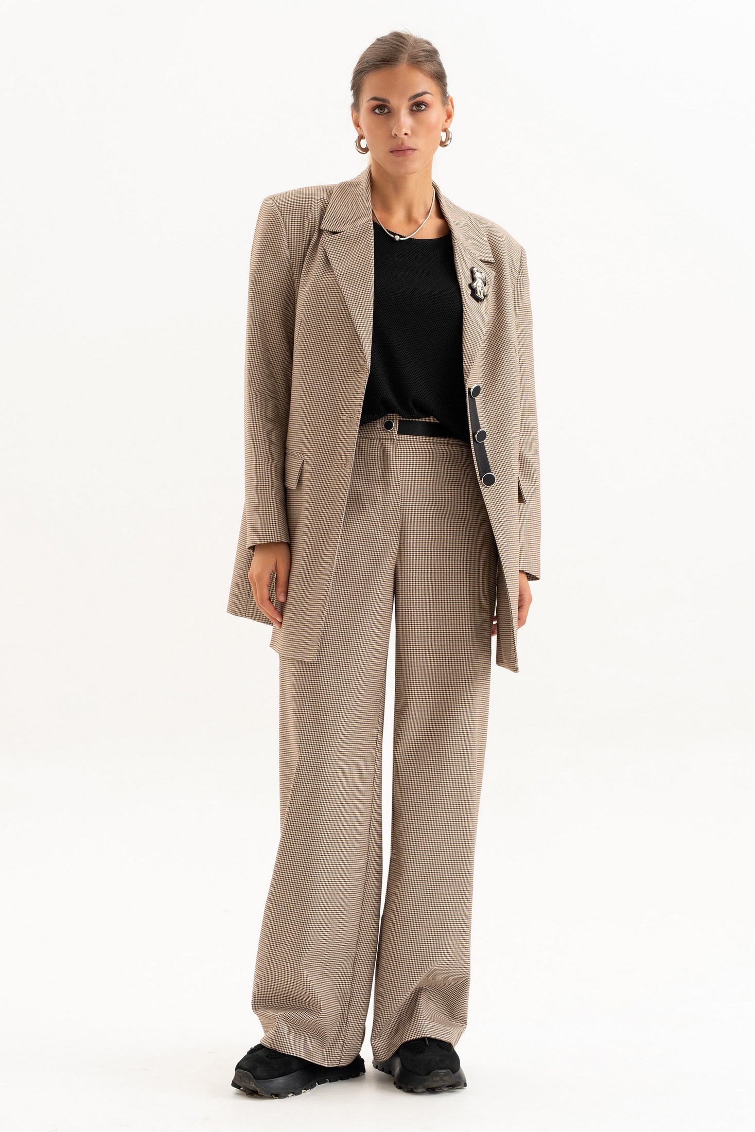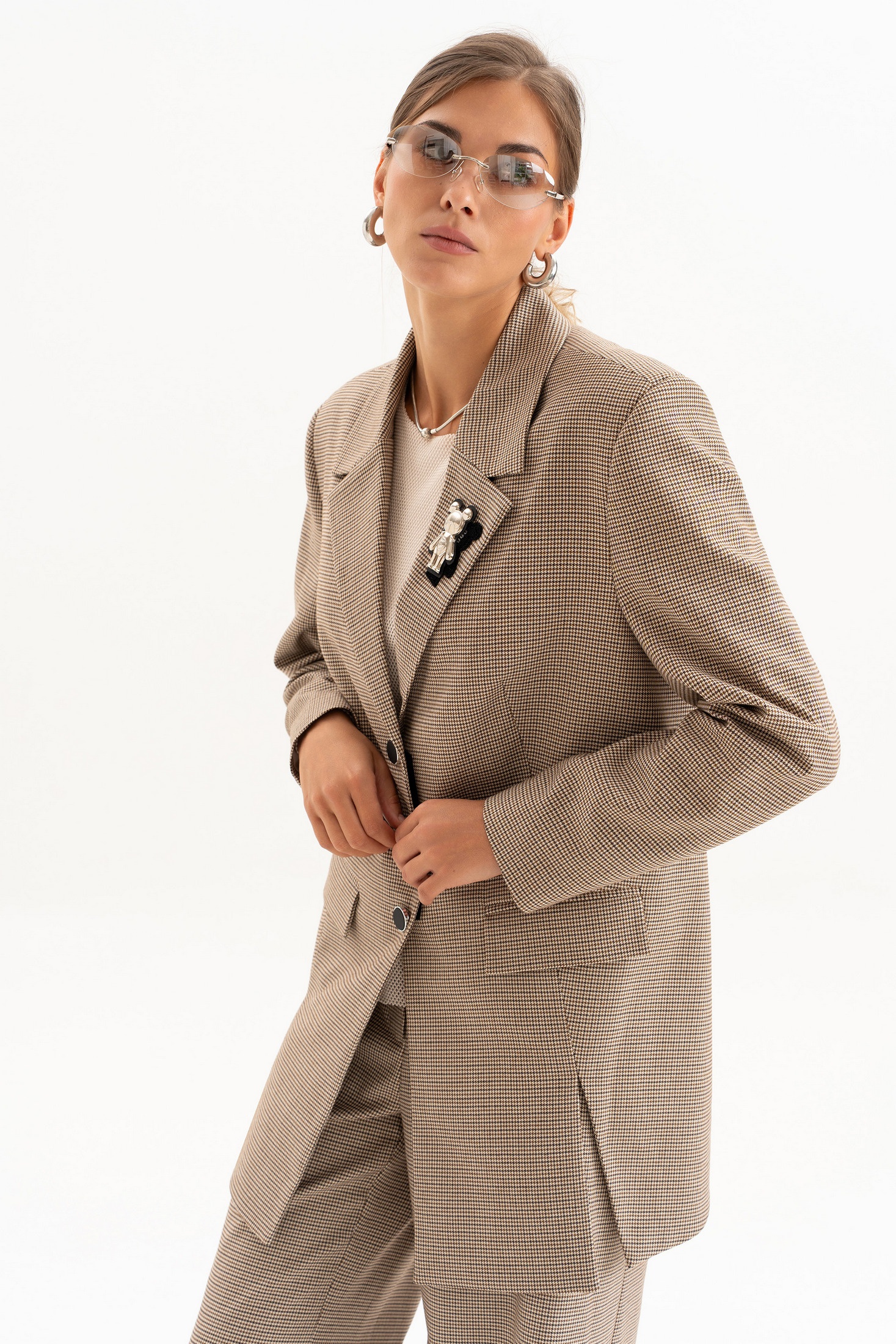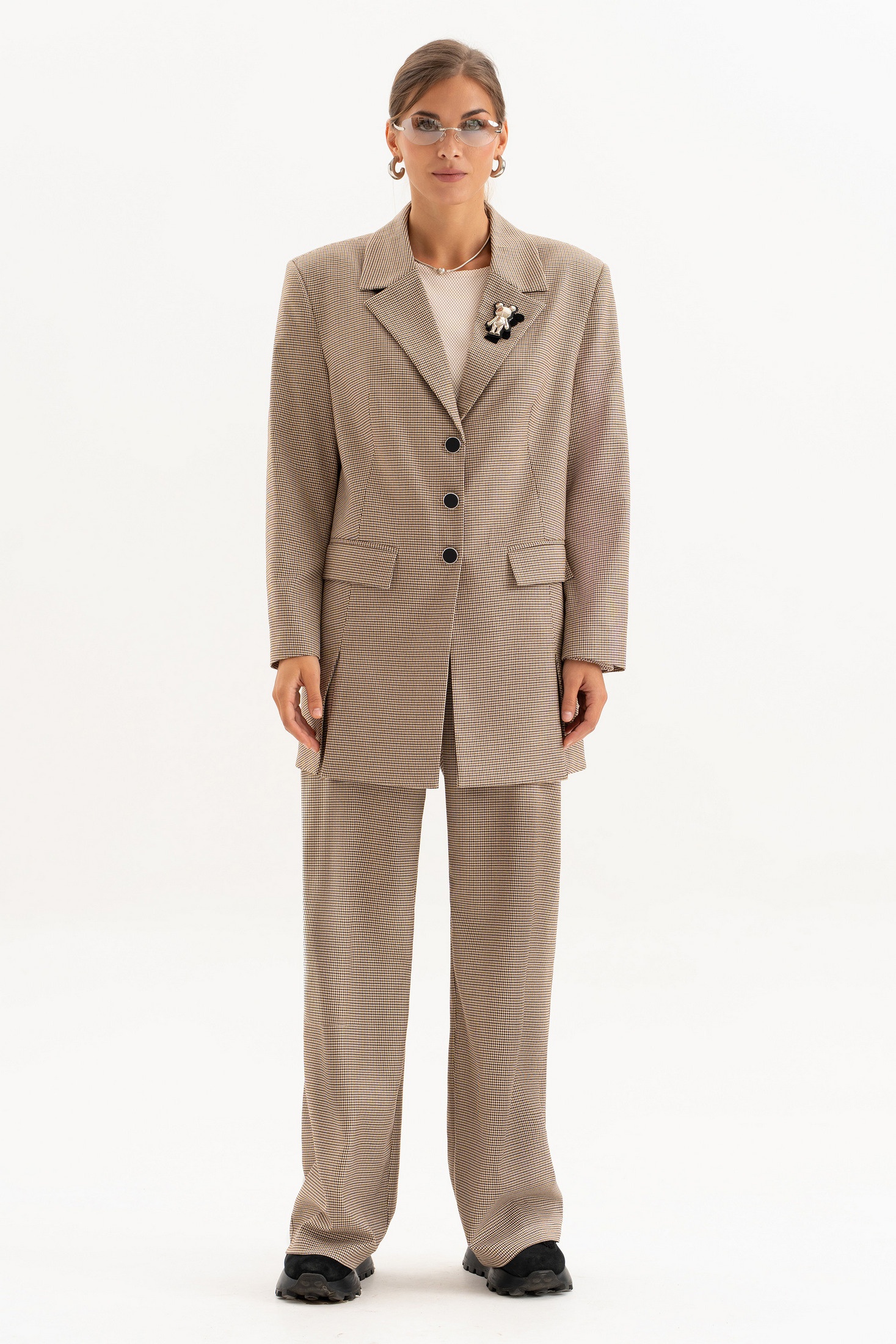 Женский костюм-двойка из костюмной ткани подходит для создания элегантного кэжуал образа.Трендовый костюм состоит из удлиннённого жакета оверсайз и прямых широких брюк. Жакет свободного кроя прямого силуэта с расширенной линией плеч с центральной застёжкой на петли-пуговицы,с разрезами, прорезными карманами и клапанами.На лацкане интересный декор ввиде нашивки-брошки"металлический мишка" ,можно отстегнуть.Брюки прямого силуэта с резинкой на талии по спинке,карманами в боковых швах.Костюм можно дополнить топом,рубашкой,кроссовками и получится casual look на каждый день. длина жакета-77см, длина рукава-60см, длина брюк по боковому шву с поясом -108см,