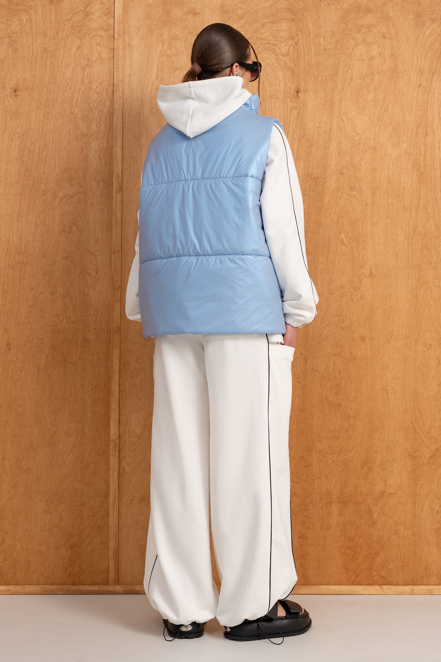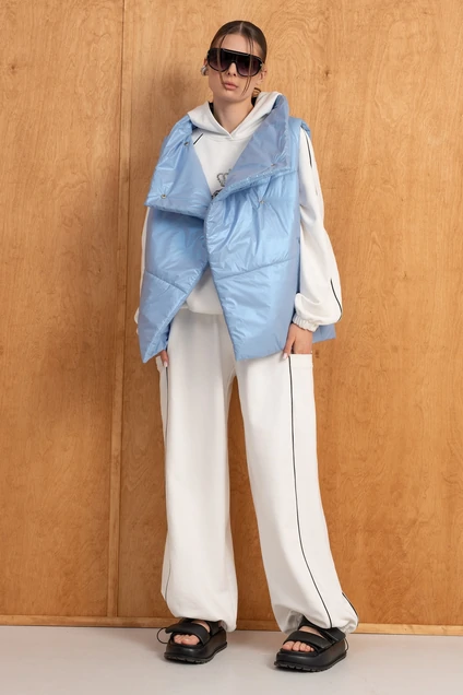 Костюм брючный 288 молоко + голубой LUNA идеально подходит для стильных прогулок и повседневной носки. Коллекция бренда LUNA воплощает комфорт и современный стиль. Жилет на синтепоне с воротником-стойкой и карманами обеспечивает дополнительное тепло в прохладную погоду, в то время как свитшот с двойным капюшоном и резинкой по низу добавляет нотку спортивной динамики. Брюки высокой посадки и возможность регулировки формы внизу делают этот костюм универсальным для любого времени года. Изготовлен из хлопка и полиэстера, комплект подарит комфорт и долговечность. Молочный и голубой цвета добавляют свежести вашему гардеробу, а контрастные канты и принты придают индивидуальность каждому элементу.