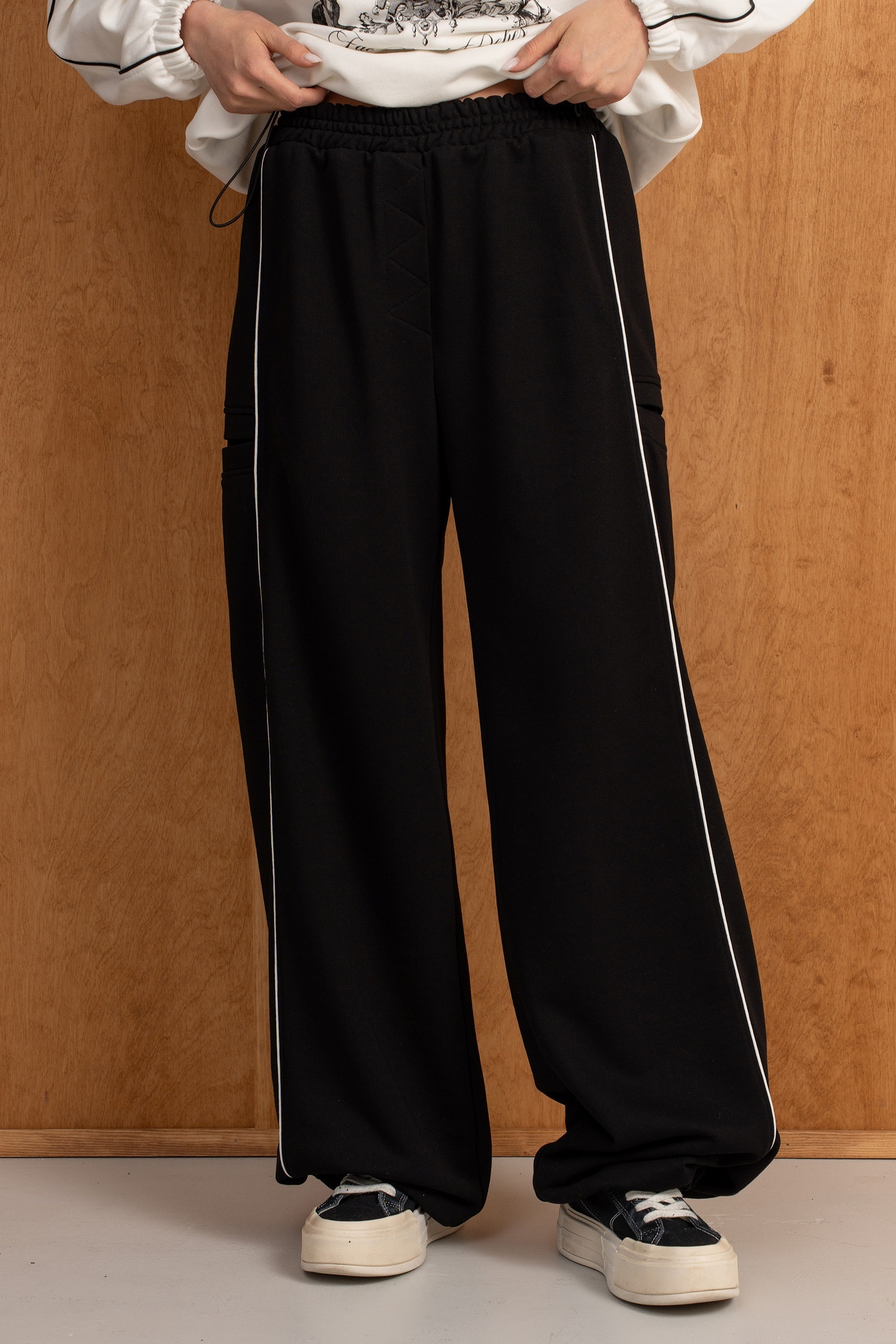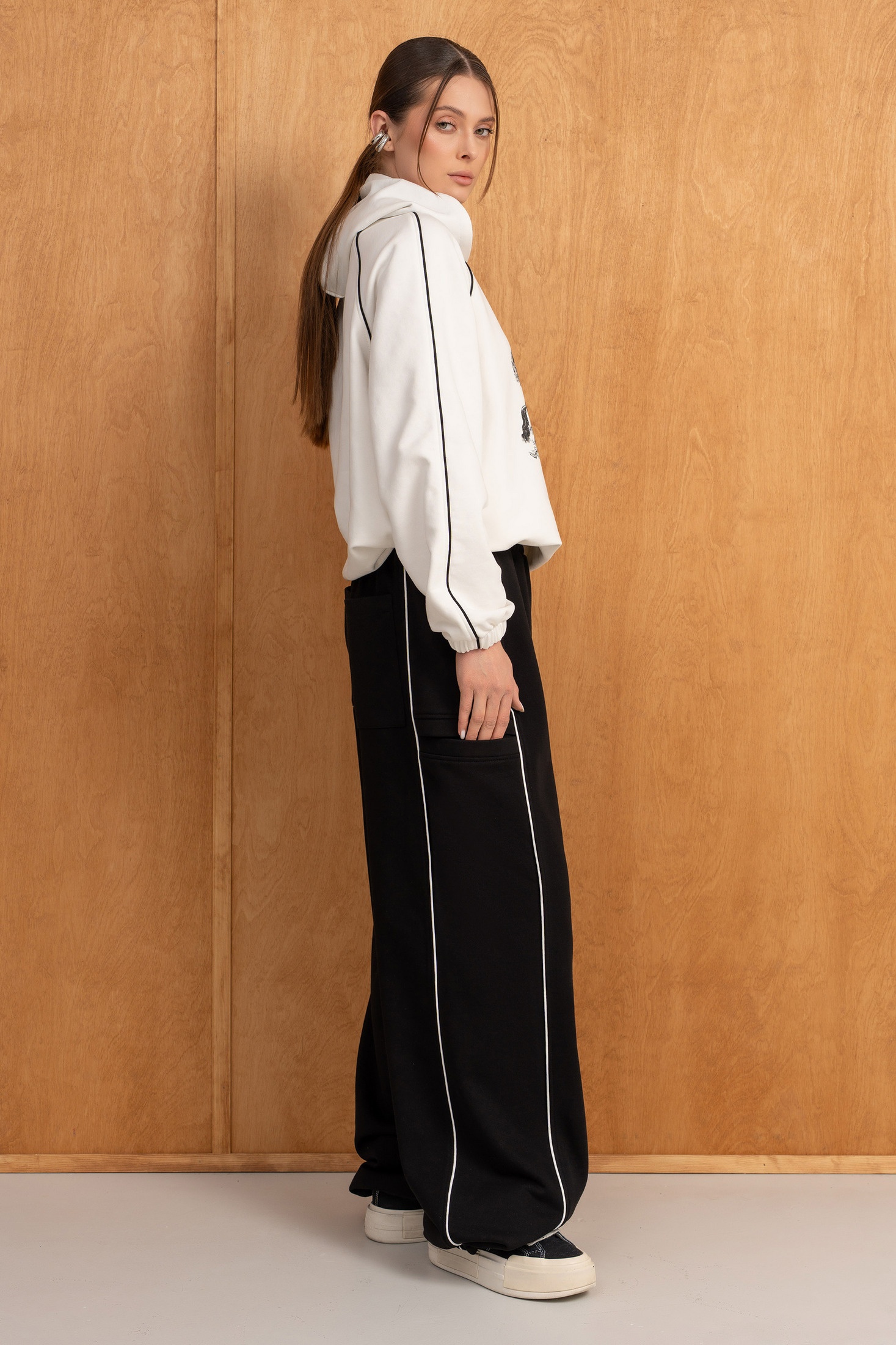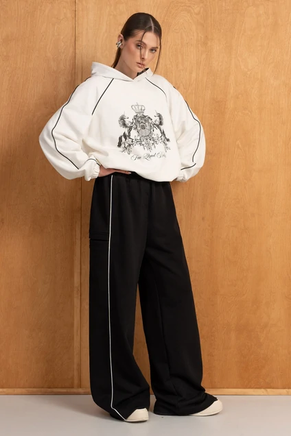 Костюм брючный 294 молоко + черный LUNA – стильный выбор для современных женщин. Коллекция бренда LUNA предлагает костюм двойку, изготовленный из качественного трикотажного футера (60% хлопок, 40% полиэстер). Свитшот имеет прямой силуэт с двойным капюшоном и рукавами-реглан, по низу – резинка с фиксатором, позволяющим регулировать объём. Брюки с высокой посадкой на резинке, дополнены резинкой с фиксатором по низу, что добавляет комфорта и позволяет менять форму. Прорезные карманы по бокам и задние накладные карманы делают костюм практичным и удобным. Контрастные канты и принт на свитшоте придают ему изюминку. Идеально подходит для повседневного использования в прохладное время года.