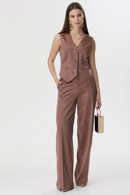 Стильный нарядный комплект, состоящий из жилета и брюк. Жилет полуприлегающего силуэта из костюмной ткани с фигурным низом. Жилет однобортный с центральной застежкой на петли и пуговицы. По переду и спинке рельефы. По переду декоративные листочки. Стильные широкие от бедра брюки прямого силуэта с высокой талией. По верху брюк притачной пояс с застежкой на петлю и пуговицу и шлевками для ремня. На передних половинках обработаны наклонные карманы и застежка молния в среднем шве. Задние и передние половинки с кантом, На задних половинках вытачки. С 48-60р в брюки на поясе вставлена эластичная тесьма (резинка). Обращаем ваше внимание, что фурнитура может незначительно отличаться от фото. !Пояс не входит в комплект ! Длина жилета: (42-46р - 44см);(48-52р - 46см )по спинке