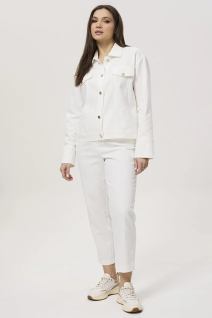 Жакет укороченный. Полочка с рельефами, застежка на петли и пуговицы, выполнена на притачной планке. Воротник рубашечного типа. Полочка и спинка с кокеткой, на спинке дизайнерская вышивка. Рукав втачной, одношовный, по низу рукава широкая притачная манжета, линия плеча спущена.