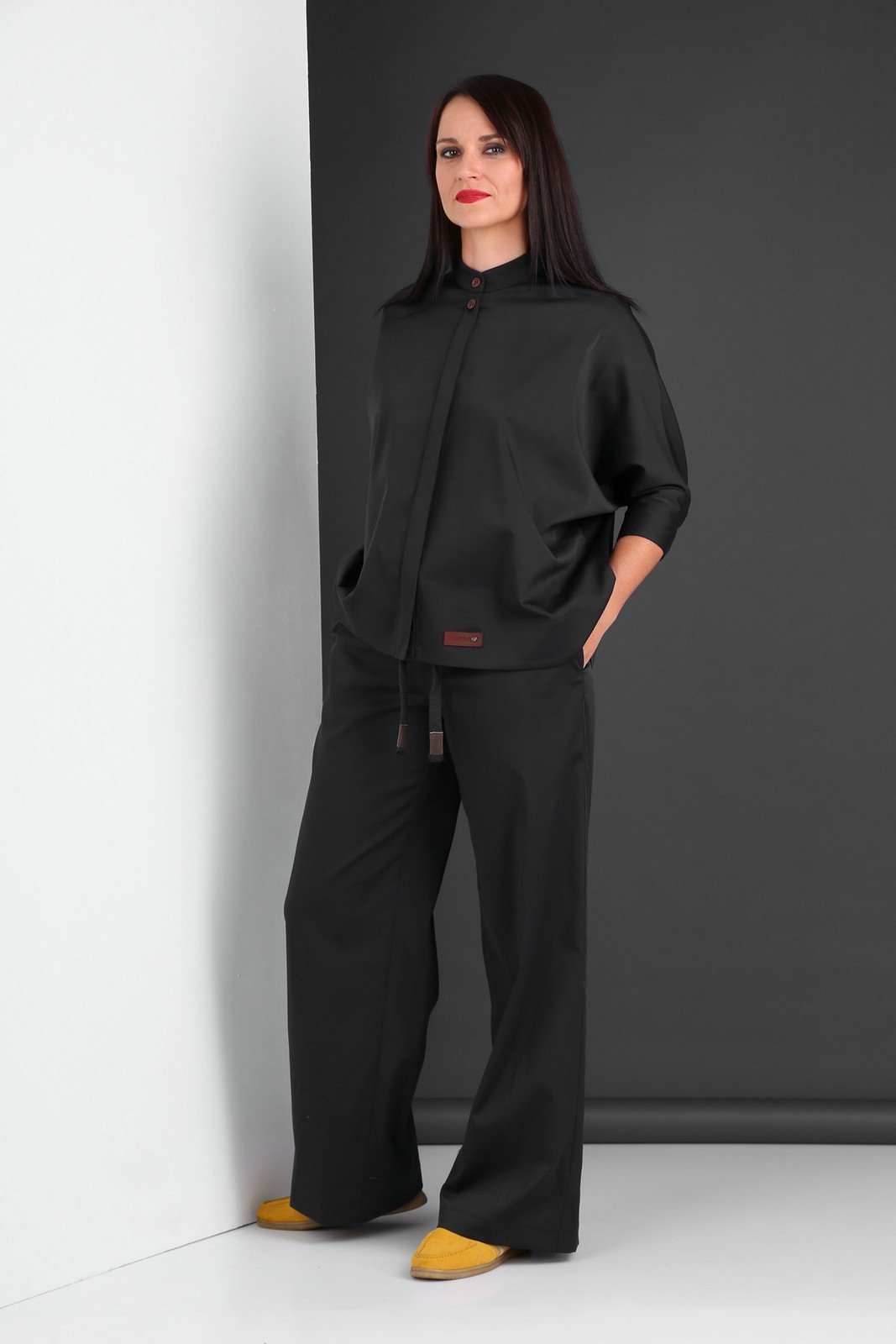 Костюм женский двухпредметный, состоящий из блузы и брюк. Блуза свободног кроя с цельнокроенным рукавом. Полочка с центральной бортовой потайной застежкой на петли-пуговицы. Спинка с поперечной вставкой, декорированой складкой. По низу рукава притачная манжета. Воротник стойка. Брюки прямого силуэта с карманами в отрезных бочках. Притачной пояс с эластичной тесьмой. Дополнительная регулировка обхвата талии с помощью шнура
