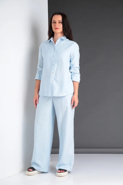 Рубашка свободного силуэта с длинным рукавом. По переду застежка на петли-пуговицы. В верхней части спинки кокетка. Воротник со стойкой, по низу рукава отрезная манжета. Длина от шва притачивания воротника до линии низа 77 см., длина рукава 62см.. Брюки прямого силуэта , без застежки. По поясу эластичная тесьма и шнур для коррекции ширины талии. В боковых швах карманы.