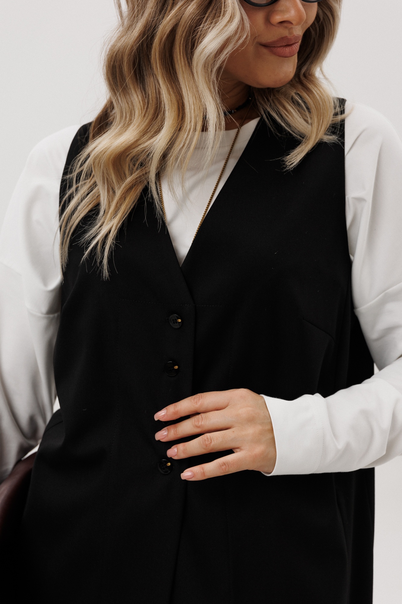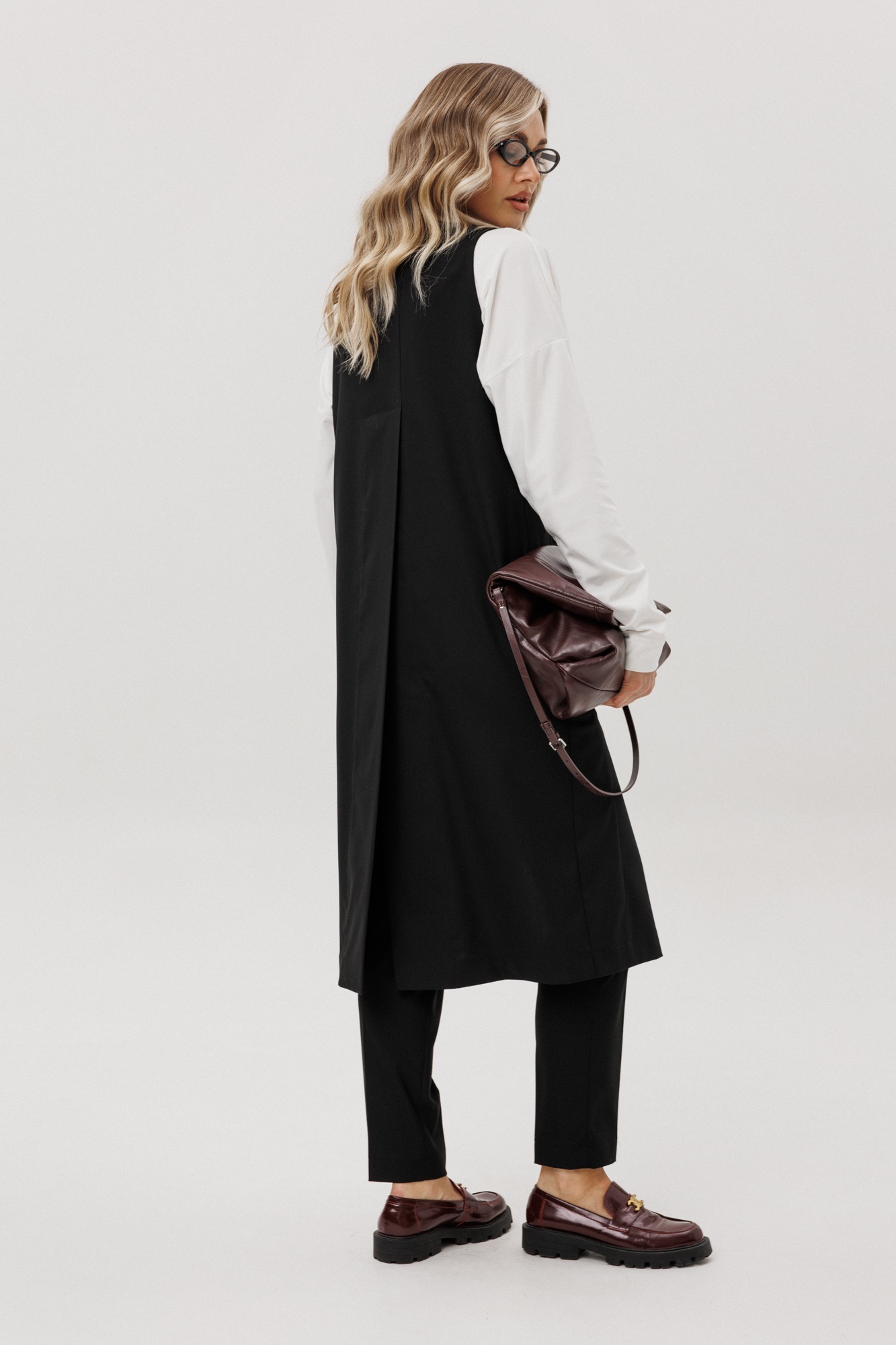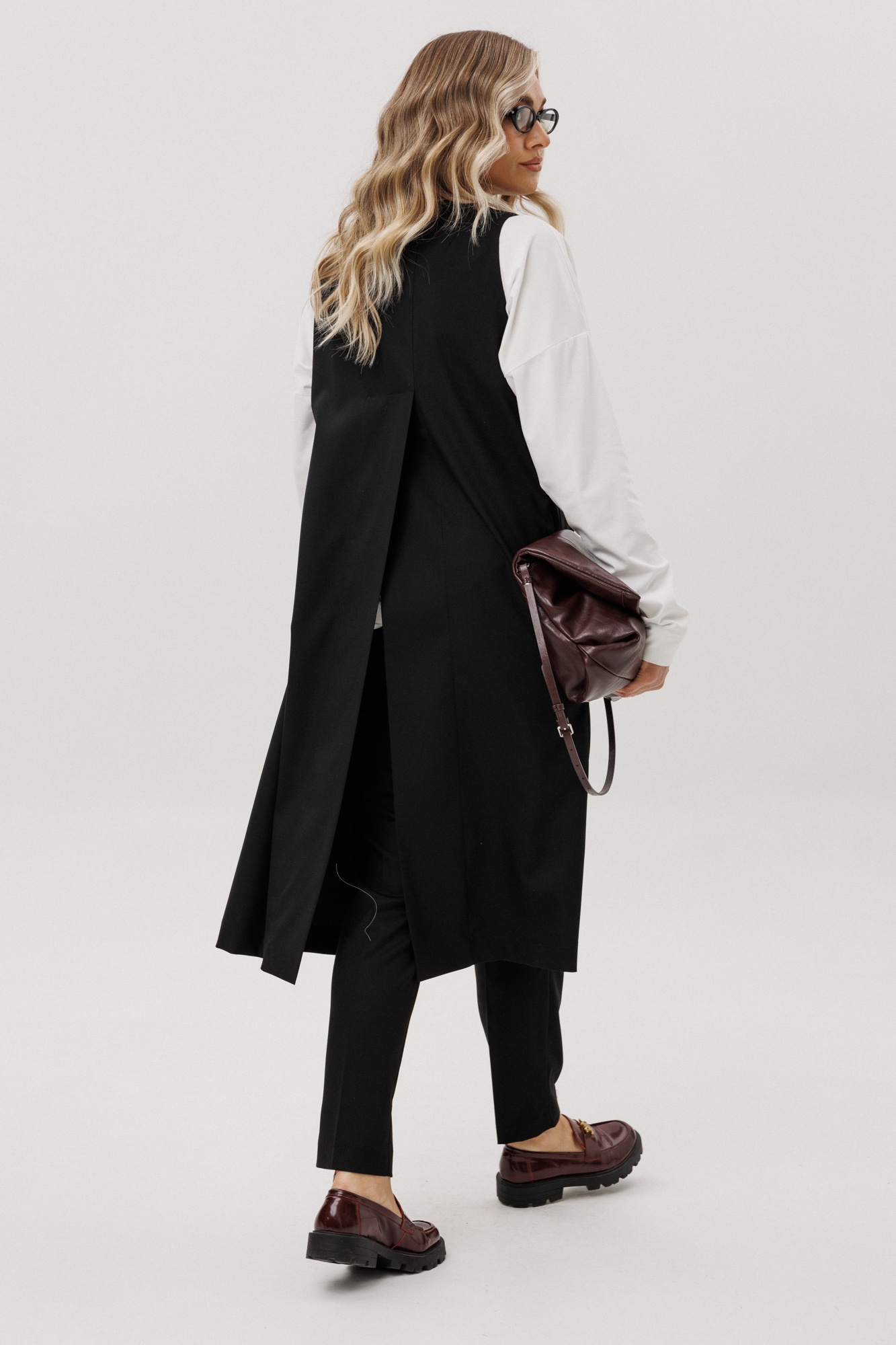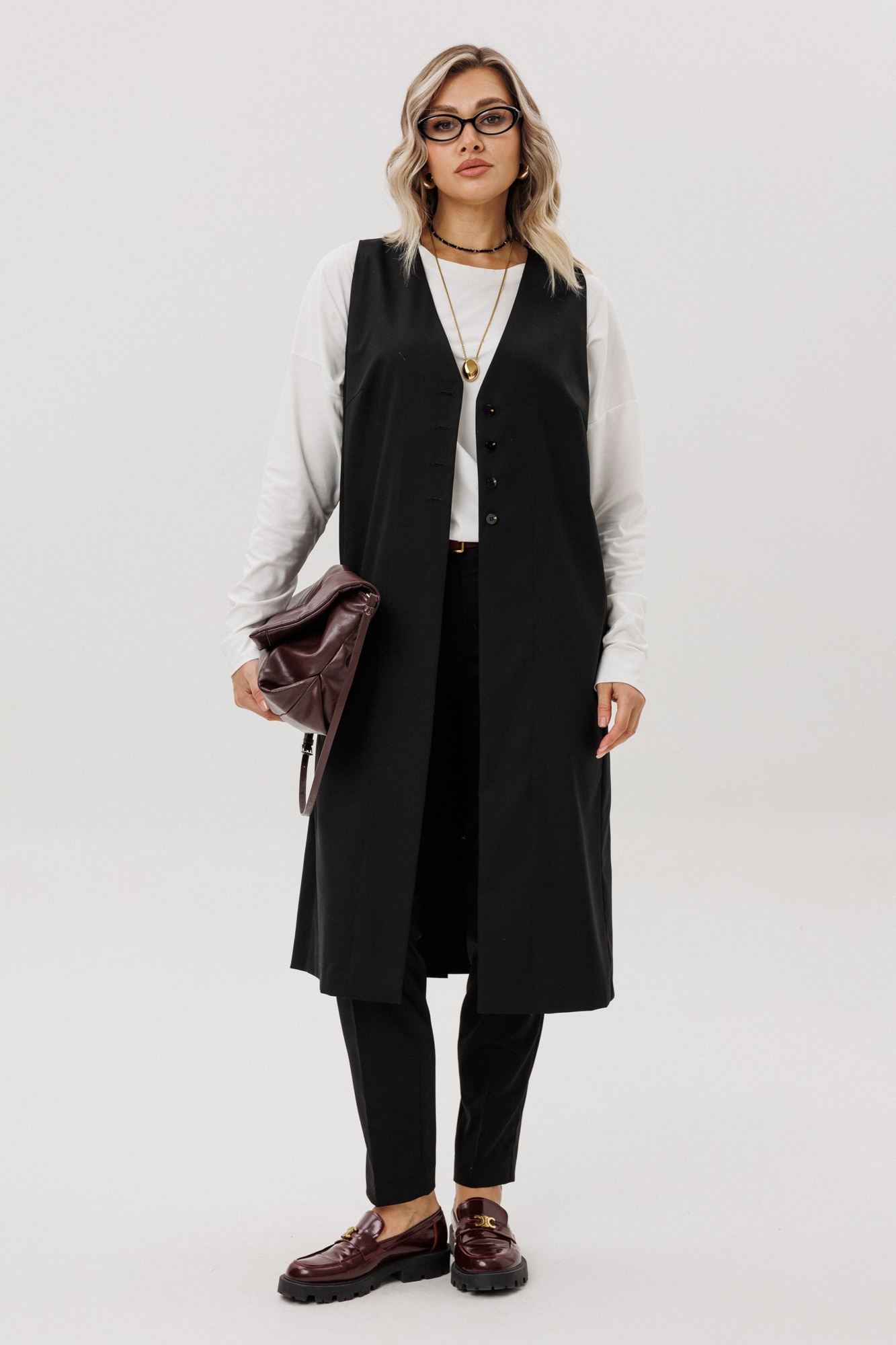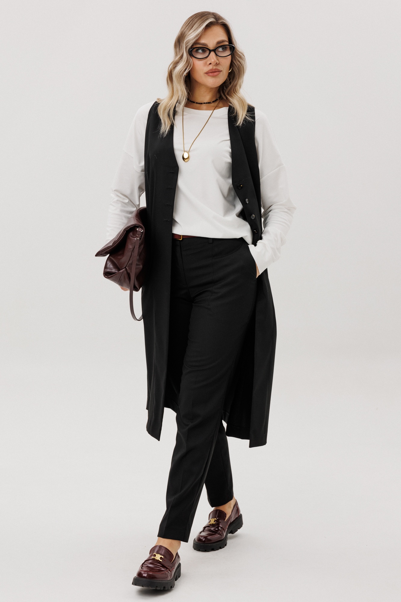 Костюм двухпредметный , состоит из Тренча и брюк. Тренч прямого силуэта без воротника. Застежка на петли-пуговицы. По переду в релефах обработагы карманы. По центру спинки расположена широкая шлица. Брюки зауженые к низу со стрелками. По боковым швам расположены карманы. Ширина линии талии по спинке регулируется резинкой