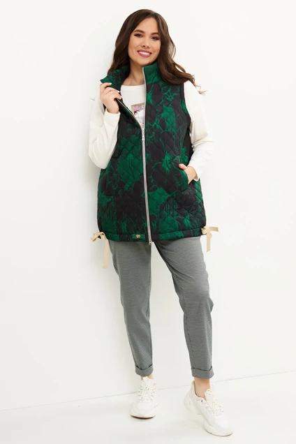 Стильный комплект из утепленного жилета, блузы и брюк. Жилет прямого кроя, на подкладке с центральной застежкой на тесьму-молнию. Дополнен боковыми карманами. По низу жилета кулиска с тесьмой. Блуза свободного кроя. Рукав втачной, слегка спущен. Выполнена из трикотажного полотна. По груди дополнена термо-аппликацией. Брюки свободного кроя, слегка заужены к низу, с притачным поясом. Пояс дополнен эластичной тесьмой. Посадка средняя. Брюки дополнены боковыми карманами. Застежка на пуговицу и молнию. Выполнены из костюмной ткани. Длина жилета от плечевого шва 75см. Длина блузы от плечевого шва 66см. Длина рукава 57. Длина брюк 95см.