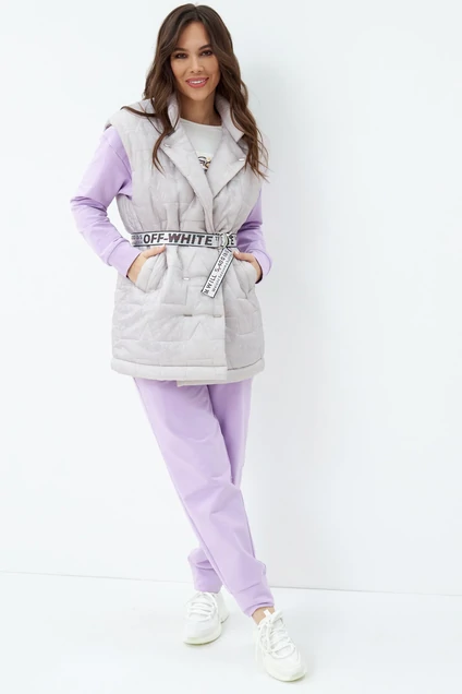 Стильный комплек из стеганого утепленного жилета, джемпера и брюк. Жилет прямого кроя, выполнен из стеганой утепленной плащевки с оригинальным, слегка переливающимся принтом, с застежкой на пришивные металлические кнопки. Дополнен боковыми карманами. Съемный пояс-тесьма в комплекте. Джемпер свободного кроя, выполнен из триктажного полотна. Рукав втачной, спущен. Брюки свободного кроя, на притачном поясе с эластичной тесьмой, дополнены боковыми карманами. Выполнены из однотонного трикотажного полотна. По низу брюки сборены на эластичную тесьму. Длина жилета от плечевого шва 80 см. Длина джемпера от плечевого шва 63 см. Длина рукава 62 см. Длина брюк 98 см. Жилет: ПЭ100%