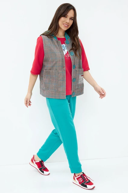Оригинальный комплект из жилета, ждемпера и брюк. Жилет свободного кроя, на подкладке с центральной застежкой на пришивные пуговицы. Жилет дополнен накладными карманами и капюшоном. Джемпер свободного кроя, рукав слегка спущен. По груди термо-аппликация. Рукав 3/4. Брюки свободного кроя, на притачном поясе с эластичной тесьмой, дополнены боковыми карманами. Выполнены из однотонного трикотажного полотна. По низу брюки дополнены притачной манжетой, выполненной из основной ткани.