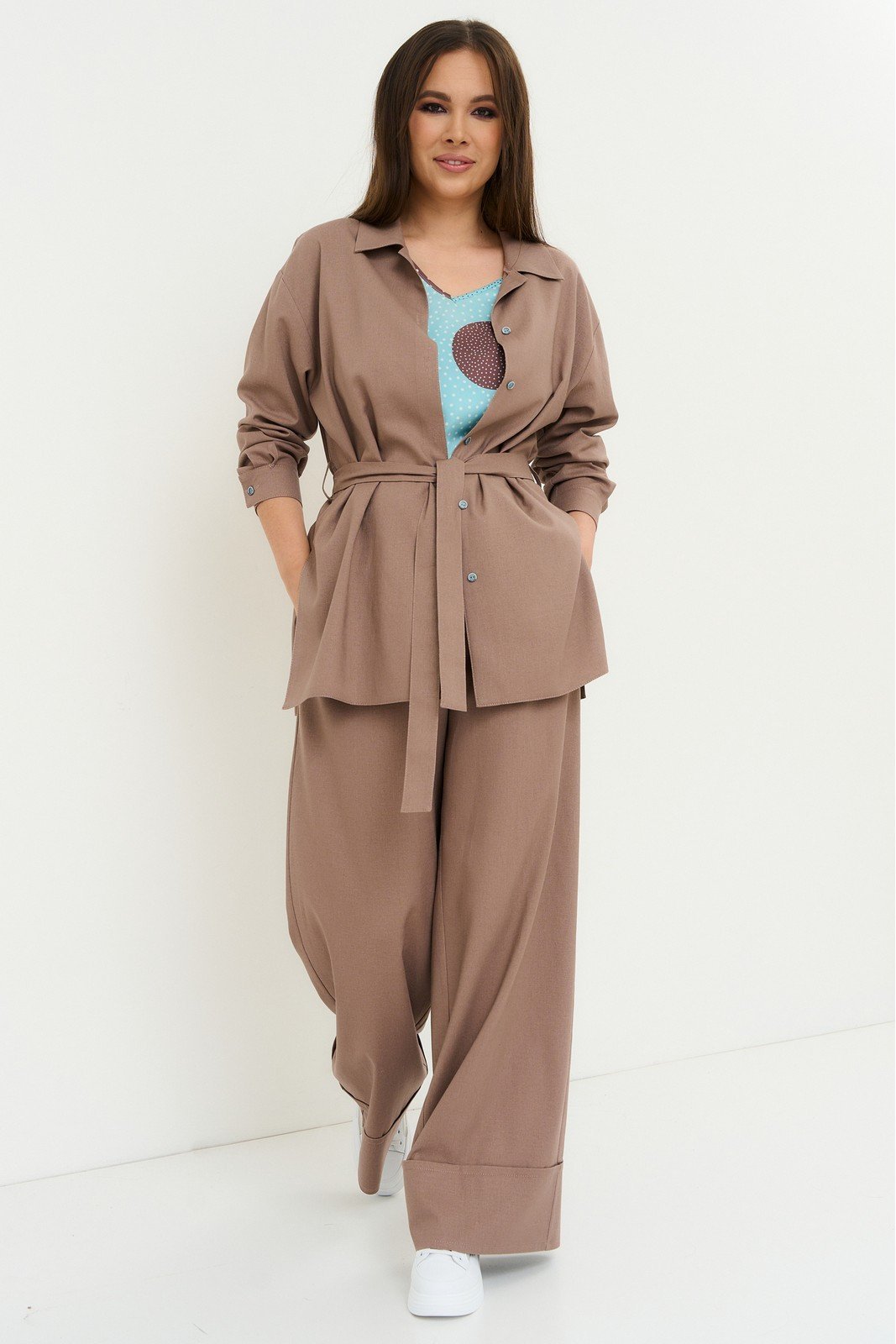 Стильный и комфортный льняной комплект из блузы, топа и брюк. Льняная блуза рубашечного кроя с отложным воротником и центральной застежкой на пришивные пуговицы. Рукав длинный , спущен, с притачной манжетой. Топ прямого кроя с цельнокроеным коротким рукавом. Широкие льняные брюки свободного прямого кроя , с притачным поясом, дополненным эластичной тесьмой. По бокам расположены удобные карманы. По низу брюки с широким подворотом. Застежка на молнию и пришивную пуговицу. Длина блузы от плечевого шва 77 см. Длина рукава 60см. Длина топа от плечевого шва 60 см. Длина брюк по боковому шву 106 см. Топ:ПЭ65% Вискоза 35%