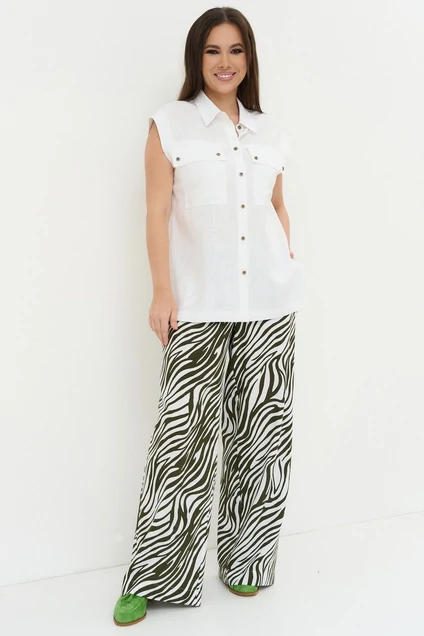 Легкий стильный комплект из натуральных ткани, состоящий из блузы и брюк. Блуза свободного прямого кроя с центральной застежкой на пришивные пуговицы. Воротник отложной на стойке. Широкие брюки прямого кроя , с притачным поясом, дополненным эластичной тесьмой. Застежка на молнию и пришивную пуговицу. Брюки дополнены боковыми карманами. Длина блузы от плечевого шва 69 см. Длина брюк по боковому шву 105 см.