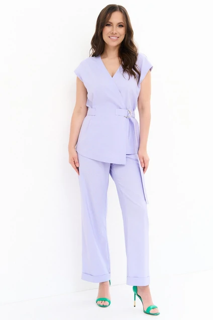 Стильный элегантный комплект из блузы и брюк. Блуза свободного кроя, с коротким рукавом, с застежкой на запах. Приталена несъемным поясом, выполненным из основной ткани. Брюки классического прямого кроя, с притачным поясом, дополненным эластичной тесьмой. Застежка на молнию и пуговицу. Брюки дополнены боковыми и задними накладными карманами. Длина блузы от плечевого шва 67см. Длина брюк по боковому шву 99см.