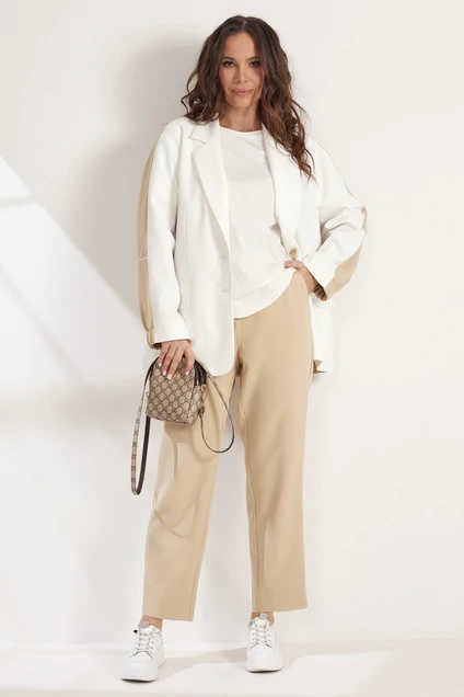 Стильный комплект из жакета-бомбера и брюк. Выполнен из костюмной ткани в идеальном сочетании молочного и бежевого цветов. Верх комплекта выполнен спереди как классический жакет, а по спинке как стильный бомбер. Оригинальное слияние стилей придает неповторимость данному комплекту. Жакет на подкладке, центральная застежка на пришивные пуговицы. Рукав втачной, слегка спущен. Воротник отложной. Жакет дополнен удобными карманами с клапанами. Спинка по низу дополнена эластичной тесьмой. Брюки классического кроя, слегка заужены книзу. Посадка средняя. Пояс притачной, дополнен эластичной тесьмой. Брюки дополнены удобными боковыми карманами. Застежка гульфик на молнию и металлическую пуговицу. Длина жакета от плечевого шва 75 см. Длина рукава 60 см. Длина брюк по боковому шву 98 см.