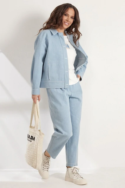 Стильный комплект из куртки, футболки и брюк. Куртка и брюки выполнены из джинсовой ткани средней плотности. Футболка выполнена из хлопкового трикотажного полотна. Куртка свободного кроя со спущенным рукавом. Центральная застежка на металлические пуговицы. Воротник отложной. Рукав дополнен притачной манжетой с застежкой на металлическую пуговицу. Куртка без подкладки, дополнена удобными боковыми карманами. По спинке куртка дополнена красивой вышивкой. Футболка свободного кроя, дополнена красивой термо аппликацией. Брюки свободного кроя, слегка заужены книзу. Посадка средняя. Пояс притачной, дополнен эластичной тесьмой. Брюки дополнены удобными боковыми карманами. Застежка гульфик на молнию и металлическую пуговицу. Длина куртки от плечевого шва 58см. Длина рукава 60см. Длина футболки от плечевого шва 60см. Длина брюк по боковому шву 95см.