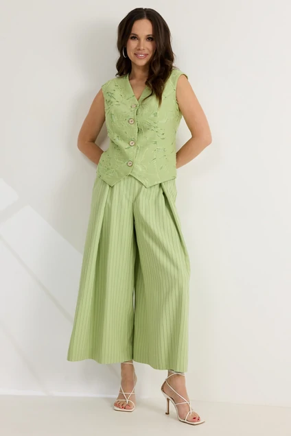 Стильный элегантный комплект из жилета и брюк. Жилет однобортный полуприлегающего силуэта, на хлопковой подкладке, с центральной застежкой на пришивные пуговицы. Выполнен из вискозного полотна с вкраплениями из органзы. Брюки кюлоты свободного кроя с притачным поясом, дополненным эластичной тесьмой. Застежка гульфик на полнию и пуговицу. Выполнены брюки из поливискозного полотна цвета лайм в меловую полоску. Дополнены удобными боковыми карманами. Длина жилета от плечевого шва 56см. Длина брюк по боковому шву 91см.