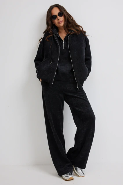 Стильный и уютный комплект из утепленного жилета, худи и брюк, выполненных из фактурного трикотажного полотна (штрукс). Жилет свободного прямого кроя с центральной застежкой на металлическую молнию. Горловина обработана стойкой. Перед жилета выполнен из трикотажного полотна, спинка выполнена из плащевой ткани. Жилет дополнен удобными боковыми карманами. Худи свободного прямого кроя со слегка спущенным рукавом. Дополнено уютным капюшоном и застежкой на металлическую молнию. Для придания формы по низу расположена кулиска на резинке с фиксаторами. Так же худи дополнено удобными карманами. Брюки прямого свободного кроя, с притачным поясом, дополненным эластичной тесьмой. Посадка средняя. По бокам брюки дополнены удобными карманами.