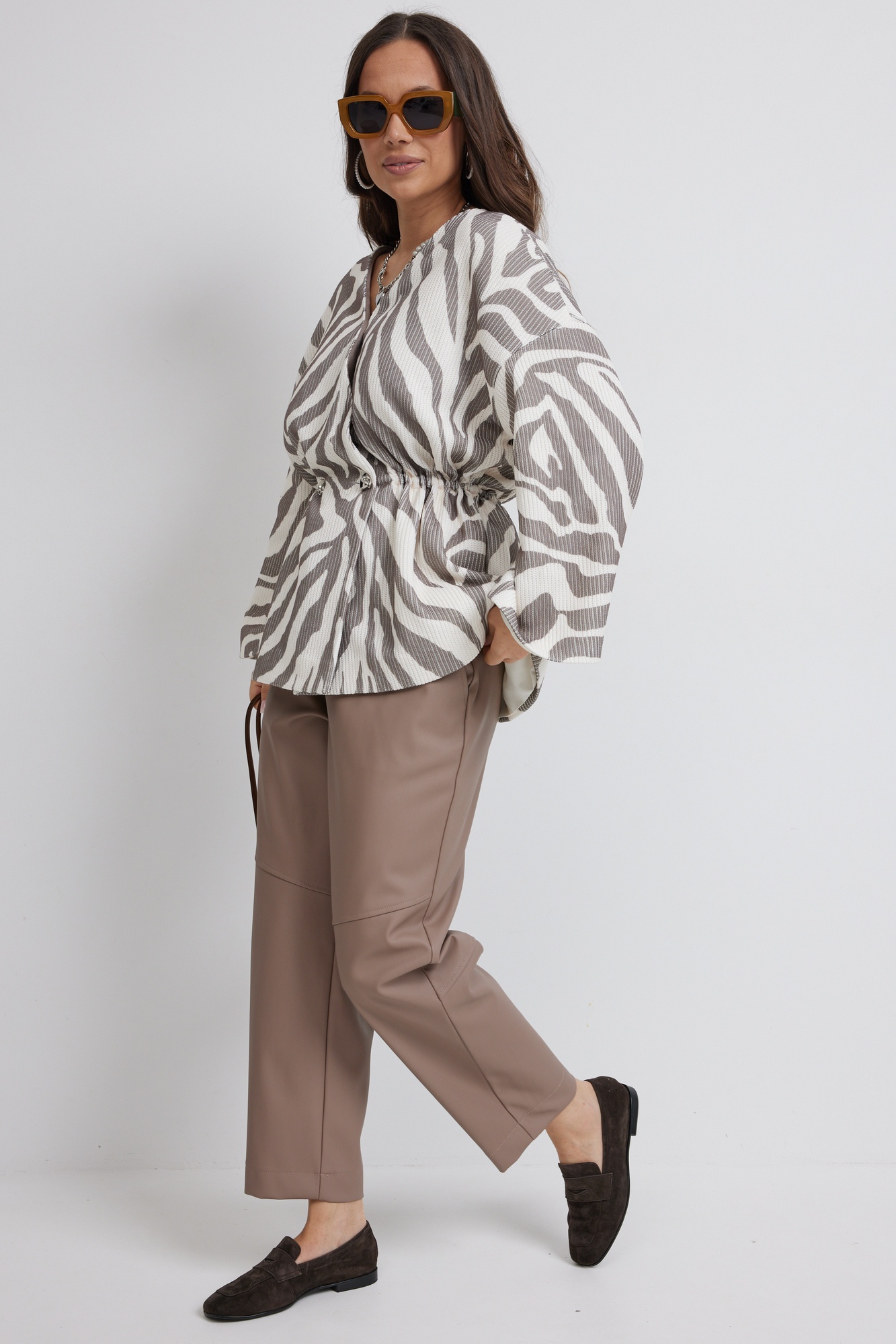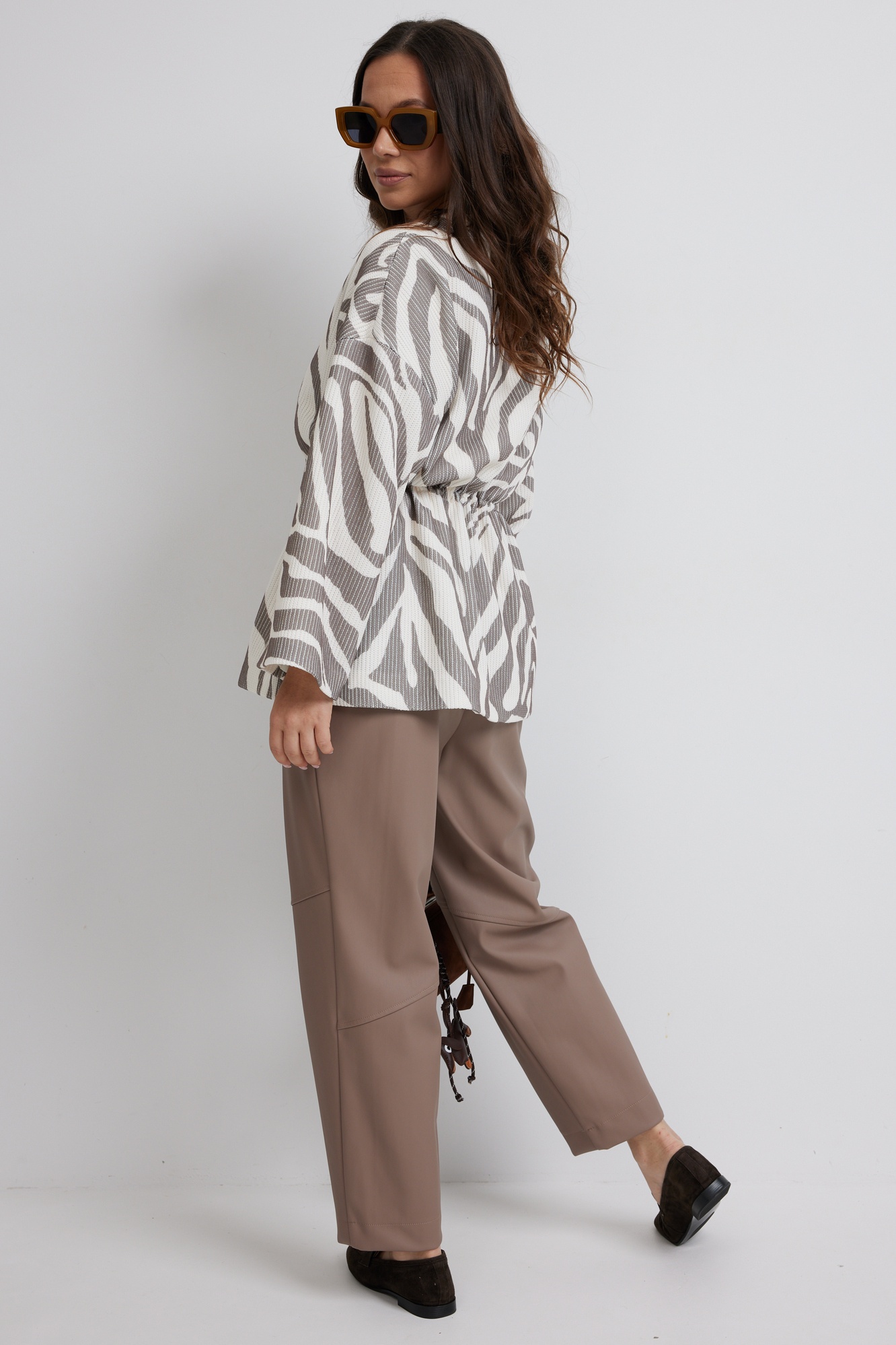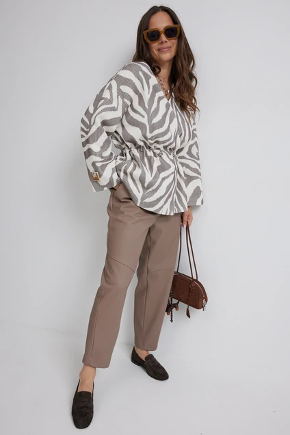 Костюм брючный 2698 коричневый + молочный Магия Моды — это стильный набор из жакета-кимоно и брюк из мягкой эко кожи. Коллекция бренда выделяет двубортный жакет свободного кроя с пришивными пуговицами и скрытой кулиской на талии, что позволяет создать приталенный силуэт. Ткань с animal принтом добавляет оригинальности, а слегка спущенная линия плеч и широкие рукава подчеркивают современный стиль. Притачной пояс брюк с эластичной тесьмой обеспечивает комфорт, а зауженный книзу крой делает комплект универсальным для осени и весны. Цветовая гамма комбинации молочного и коричневого подчеркивает изысканность и добавляет образу утонченности. Длина жакета 75 см, рукава—60 см, брюк—94 см по боковому шву.