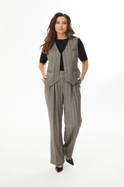 Костюм женский, состоящий из жилета и брюк. Жилет полуприлегающего силуэта на полной подкладке и застежкой на пуговицы. По переду прорезной карман, сзади - хлястик с застежкой на 2 пуговицы. Брюки свободного силуэта с косыми карманами. Пояс брюк прямой, из пояса по переду с каждой стороны от гульфика по две складки. Застежка на пуговицы и молнию.