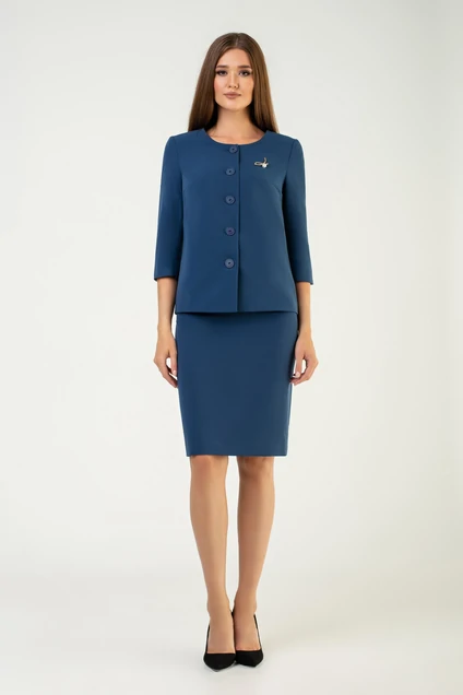 Комплект женский состоит из жакета и юбки (двойка). Жакет свободного силуэта на подкладке. Горловина округлой формы, застёжка центральная бортовая на декоративные петли и пуговицы. Рукав втачной двухшовный , укороченный, в локтевом шве с разрезом. Спинка со средним швом. Юбка классическая, зауженная к низу, на подкладке, верхний срез оформлен поясом. В центральном шве заднего полотнища- застёжка на потайную тесьму- молнию и пуговицу, снизу разрез. Длина юбки 65-67 см. Длина жакета по спинке 58 см.