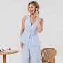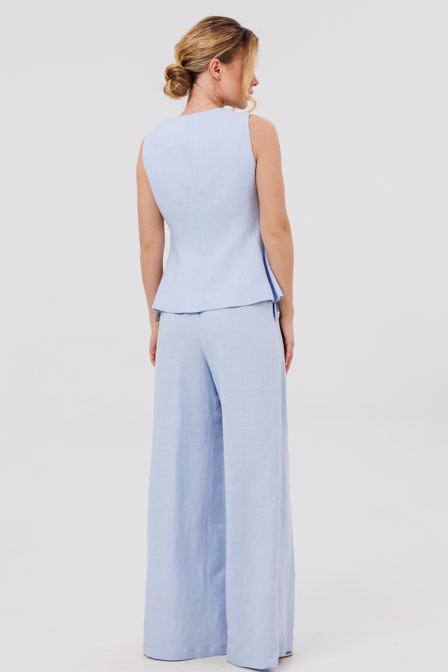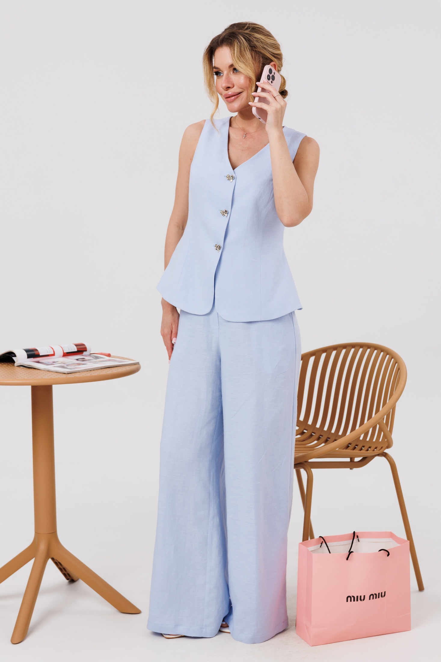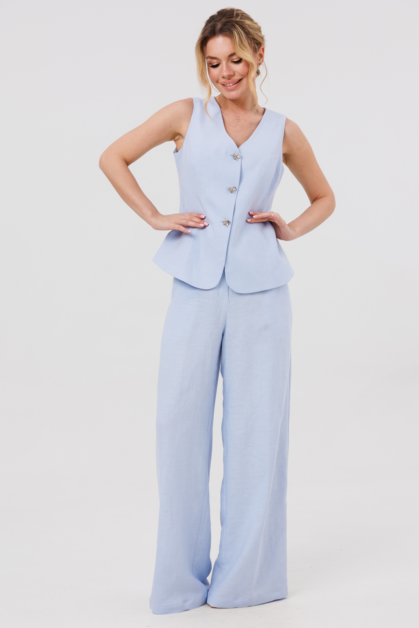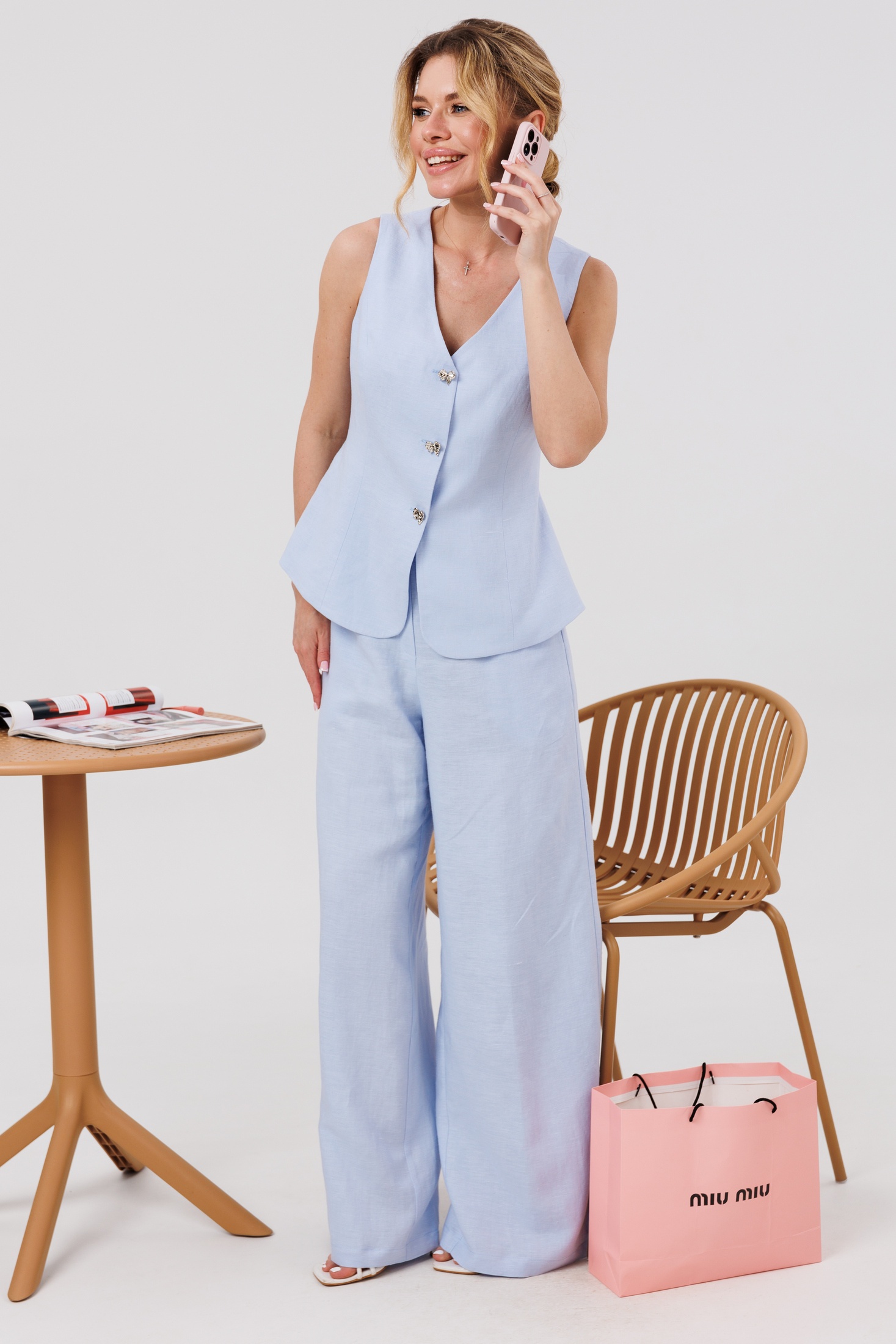 Очаровательный женский брючный костюм, выполненный в нежно-голубом цвете, добавит изысканности к вашему гардеробу. Костюм состоит из элегантной жилетки и широких брюк палаццо. Жилетка малого объема с красивыми пуговицами изящно расклешается от талии вниз, придавая образу легкость и женственность. Брюки на притачном поясе, с удобной резинкой сзади, обеспечивают комфорт при носке. Комбинация льна с вискозой делает костюм приятным на ощупь и идеально подходит для теплой погоды. Этот костюм будет уместен как в офисе, так и на специальных мероприятиях, демонстрируя изысканный вкус и стиль.
