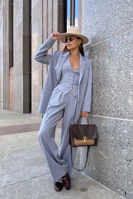 Костюм состоит из жакета, брюк и жилета. Жакет свободного кроя с центральной застежкой на петли-пуговицы. Воротник пиджачного типа, имеются прорезные карманы в рамку с клапанами. В верхней части переда имитация кармана с листочкой. Рукав двухшовный, втачной. Жакет на подкладке. Брюки широкие, на притачном поясе со складками и стрелками по переду. Имеются карманы с отрезными бочками. Застежка брюк на молнии с гульфиком. Жилет классический, приталенный с центральной застежкой на петли-пуговицы. Низ изделия - фигурный. По спинке обработан хлястик с регулировкой. Жилет на подкладке.