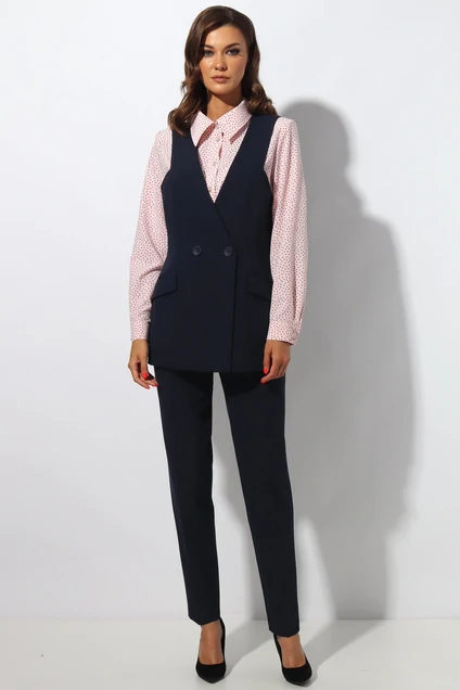 Брючный комплект состоит из жилета,блузки и брюк.Жилет полуприлегающего силуэта с фигурным подрезом от проймы и по линии талии. На полочке функциональный накладной карман с клапаном. По горловине V-oбразный вырез , двубортная застёжка на петли пуговицы.Длина жилета по спинке:69 см.Блузка( в горошек) прямого силуэта с отрезной планкой по центру полочки.Воротник отложной на отрезной стойке.Застёжка на петли пуговицы. Рукав втачной с манжетой с застежкой на две пуговицы.Длина блузки 60 см.Рукав 61 см.Брюки на притачном поясе.В боковых швах карман с отрезным бочком. Застежка на тесьму молния. Длина брюк: 97 см. Состав блузки :ПЭ 100%.Подойдет на рост 164-170 см.Цвет блузки : розовый в синий горошек.Цвет основной ткани :темно-синий.