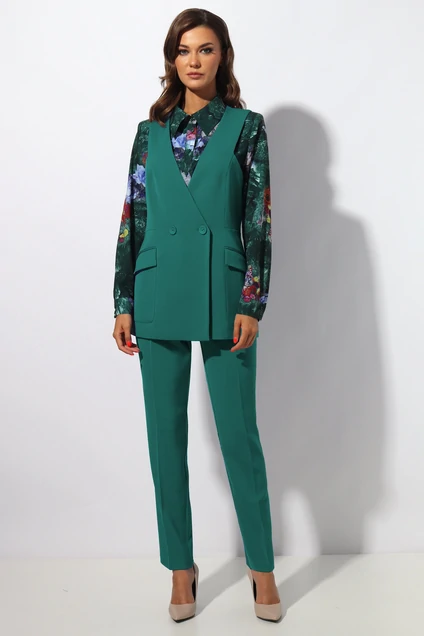 Брючный комплект состоит из жилета,блузки и брюк.Жилет полуприлегающего силуэта с фигурным подрезом от проймы и по линии талии. На полочке функциональный накладной карман с клапаном. По горловине V-oбразный вырез , двубортная застёжка на петли пуговицы.Длина жилета по спинке:69 см.Блузка прямого силуэта с отрезной планкой по центру полочки.Воротник отложной на отрезной стойке.Застёжка на петли пуговицы. Рукав втачной с манжетой с застежкой на две пуговицы.Длина блузки 60 см.Рукав 61 см.Брюки на притачном поясе.В боковых швах карман с отрезным бочком. Застежка на тесьму молния. Длина брюк: 97 см. Состав блузки :ПЭ 100%.Подойдет на рост 164-170 см.Цвет блузки :зеленый с ярким принтом .Цвет основной ткани :темный бирюзово-зеленый.