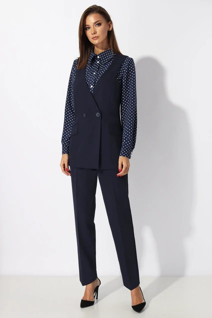 Брючный комплект состоит из жилета,блузки и брюк.Жилет полуприлегающего силуэта с фигурным подрезом от проймы и по линии талии. На полочке функциональный накладной карман с клапаном. По горловине V-oбразный вырез , двубортная застёжка на петли пуговицы.Длина жилета по спинке:69 см.Блузка( в горошек) прямого силуэта с отрезной планкой по центру полочки.Воротник отложной на отрезной стойке.Застёжка на петли пуговицы. Рукав втачной с манжетой с застежкой на две пуговицы.Длина блузки 60 см.Рукав 61 см.Брюки на притачном поясе.В боковых швах карман с отрезным бочком. Застежка на тесьму молния. Длина брюк: 97 см.Состав блузки :ПЭ 100%.Подойдет на рост 164-170 см.Цвет блузки : темно-синий в белый горошек .Цвет основной ткани :темно-синий.