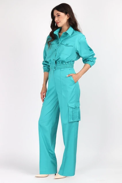 Костюм женский состоит из жакета и брюк. Жакет свободного силуэта с застёжкой на петли и пуговицы .По низу эластичная резинка.Линия плечевого шва спущена,рукав рубашечка кроя,низ на резинке.На полочке функциональные накладные карманы.Брюки-карго высокой посадки с карманами на боковых швах.На передних половинках отстроченный кант.В боковых швах карманы с отрезным бочком.На задних половинках клапаны.Длина жакета 46 см,длина рукава от начала горловины 73 см. Длина брюк с поясом 110 см. Подойдет на рост 164-170 см.Цвет:ярко-бирюзовый.