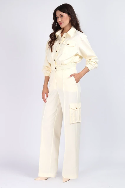 Костюм женский состоит из жакета и брюк. Жакет свободного силуэта с застёжкой на петли и пуговицы .По низу эластичная резинка.Линия плечевого шва спущена,рукав рубашечного кроя,низ на резинке.На полочке функциональные накладные карманы.Брюки-карго высокой посадки с карманами на боковых швах.На передних половинках отстроченный кант.В боковых швах карманы с отрезным бочком.На задних половинках клапаны.Длина жакета 45 см,длина рукава от начала горловины 73 см. Длина брюк с поясом 110 см. Подойдет на рост 164-170 см.Цвет:ванильный.