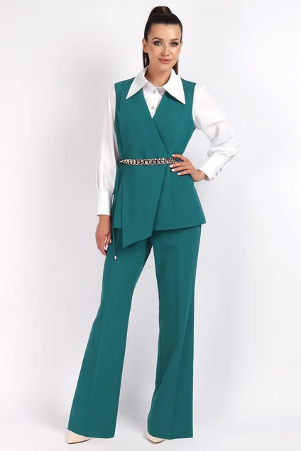 Костюм женский состоит из блузки, жилета и брюк.Жилет полуприлегающего силуэта с асимметричным отложным краем борта ,с застёжкой на потайную пуговицу.По линии талии завязывающийся пояс с декоративной цепочкой. Брюки классической посадки,к низу расширенные от колена.На поясе декоративное украшение в виде цепочки.Застежка в брюках на спинке на потайную тесьму молния.Длина жилета по спинке 68 см,длина брюк по боковому шву с поясом 107 см ( р-р 46,48,50).В размерах 52,54 на 1 см длиннее.Блузка полуприлегающего силуэта с застёжкой на петли и пуговицы.По горловине отложной воротник на отрезной стойке.Рукав втачной со складками по низу на притачной манжете с застёжкой на петли и пуговицы.Длина блузки 60 см, длина рукава 61 см.Жилет и брюки изготовлены из текстильной ткани: 71% пэ,23% вискоза,6% спандекс. Жилет на подкладке.Подкладка:100% ПЭ. Цвет костюма:темный бирюзово-зеленый.Цвет блузки:белый.Подойдет на рост 164-170 см.