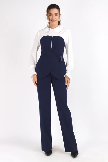 Костюм женский состоит из жилета,блузки и брюк. Жилет прилегающего силуэта,корсетного кроя с застёжкой по центру на металлическую тесьму молния и асимметричной застёжкой на пряжку и потайную петлю,и пуговицу. В боковых швах разрез.Низ полочки и спинки асимметричный.Жилет на подкладке.Брюки классической посадки ,прямые с застёжкой на тесьму молния.По линии талии притачной пояс с застёжкой на петлю и пуговицу.В боковых швах карман с отрезным бочком. Состав основной ткани: 71% Пэ,23 вискоза,6% спандекс. Блузка полуприлегающего силуэта.По горловине отложной воротник с застёжкой на пуговицу по спинке. Рукав втачной со сборкой по низу на эластичную нить "венгерка".Длина жилета по спинке 42 см. Длина блузки 56 см, длина рукава 66 см.Длина брюк 113 см.Подойдет на рост 164-170 см.Цвет основной ткани :темно-синий.