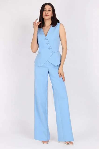 Костюм женский состоит из жилета и брюк.Жилет полуприлегающего силуэта с асимметричной застёжкой на петли и пуговицы.Брюки классической посадки.По переду застёжка на тесьму молния.Длина жилета по спинке 55 см,длина брюк по боковому шву с поясом 112 см.Жилет и брюки изготовлены из текстильной ткани. Жилет на подкладке.Подкладка:100% ПЭ. Цвет костюма:голубой.Подойдет на рост 164-170 см.