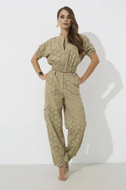 Костюм женский состоит из блузки и брюк.Блузка укороченная,на резинке по линии талии. Застежка на декоративную тесьму молния.По горловине плосколежащий воротник - стойка. Рукав короткий, низ обработан манжетой на резинке.Брюки (подкладка в виде шорт) классической посадки,с накладными карманами и клапаном на боковых швах.По линии талии резинка.Застёжка на тесьму молния.По низу эластичная тесьма с фиксатором.Длина блузки(бомбера) 47 см,длина рукава от начала горловины 42 см.Длина брюк 106 см.Цвет:оливковый.