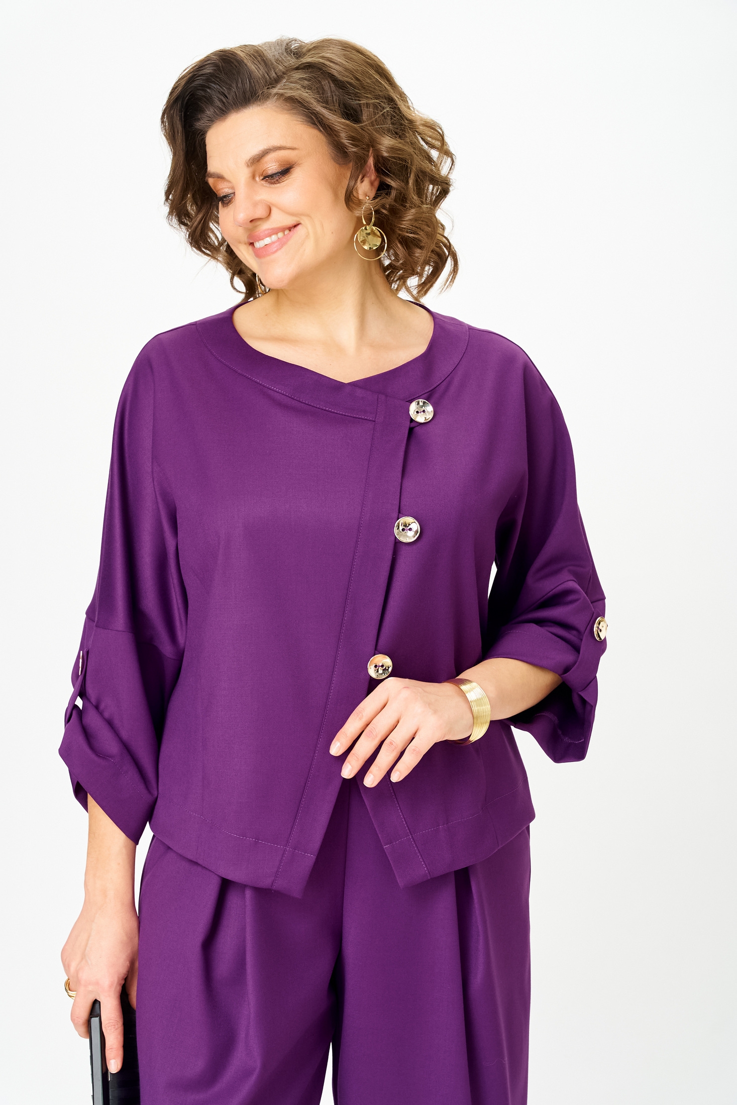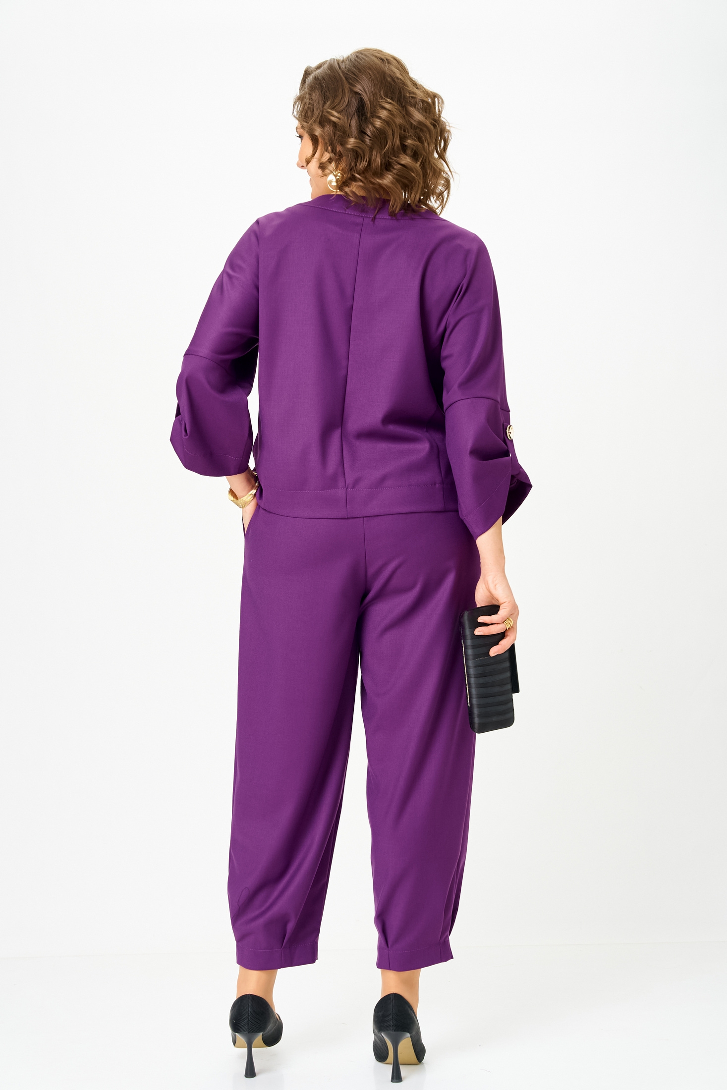 Костюм брючный 1436-1 пурпур Michel Chic — стильный выбор для современной женщины. Коллекция бренда Michel Chic представляет этот универсальный комплект, который можно носить как вместе, так и по отдельности. Изготовлен из 100% полиэстера, костюм отличается лёгкостью и долговечностью материала. Пурпурный цвет освежает образ и выделяет вас в толпе, а асимметричная застёжка добавляет оригинальности. Брюки с защипами и свободная посадка обеспечивают комфорт, в то время как топ можно носить как жакет для офисных и повседневных выходов. Дополнительные размеры: длина жакета по спинке 56 см, длина рукава 50 см, длина брюк по боковому шву 98 см. Подходит на рост 170 см. Идеально для сезона весна-осень.