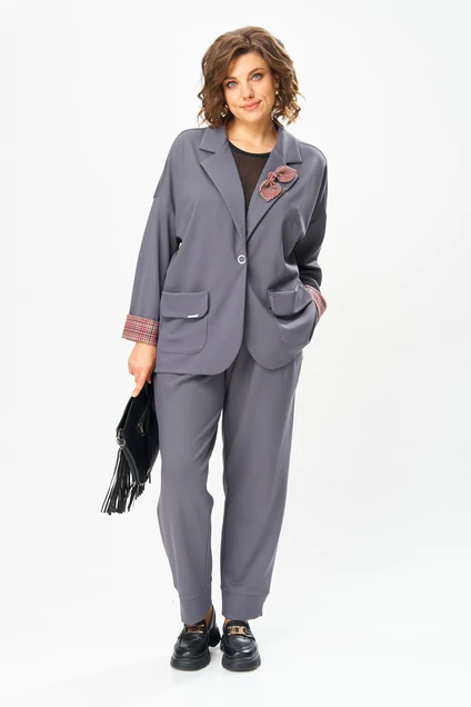 Длина жакета по спинке 72 см +\- 1 см, длина рукава 68 +\- 1-2 см. Длина брюк по шаговому шву 75 см +\- 1 см, по боковому шву 101 см +\- 1см. Изделие подойдет на рост 170 см.