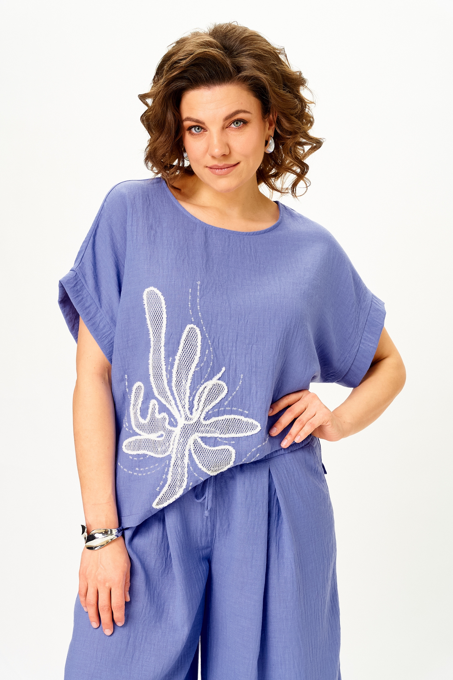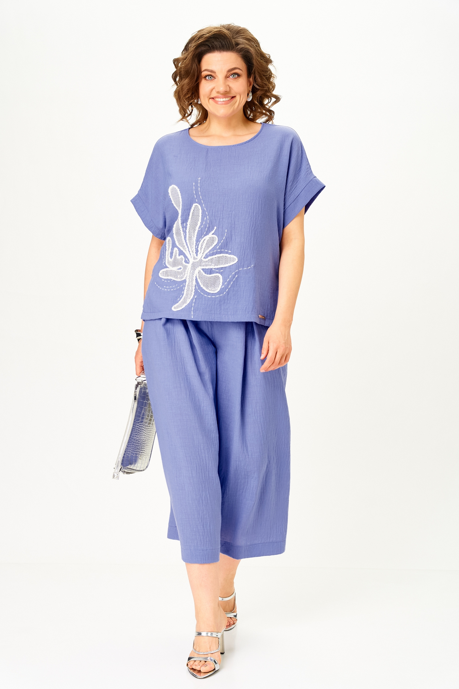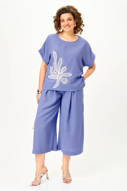 Костюм брючный 1451 пыльно-васильковый Michel Chic — это идеальный выбор для летнего гардероба. Коллекция бренда Michel Chic предлагает этот комплект из легкого искусственного муслина — дышащая ткань, которая не прилипает к телу, сохраняет свежесть и быстро сохнет. Свободный фасон кюлот палаццо с поясом на резинке обеспечивает комфорт и свободу движений, а защипы добавляют визуальной легкости. Топ с выразительной вышивкой усиливает стильный акцент образа. Костюм выполнен в ярком пыльно-васильковом цвете — идеальное решение для города, отдыха и путешествий. Длина блузы по спинке составляет 60 см, кюлоты по шаговому шву — 55 см, по боковому шву — 86 см. Легкий и стильный комплект, который станет любимцем вашего летнего гардероба.