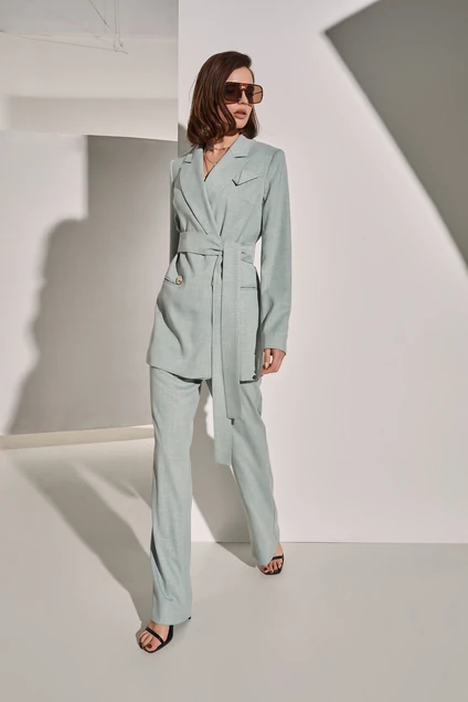Брючный костюм актуального силуэта 2021 г, основанный на классической модели в американском деловом стиле. Особый эффект придают плечевые накладки, в комплекте удобный пояс шириной 5 см. Жакет на подкладке, брюки для большего удобства - на резинке