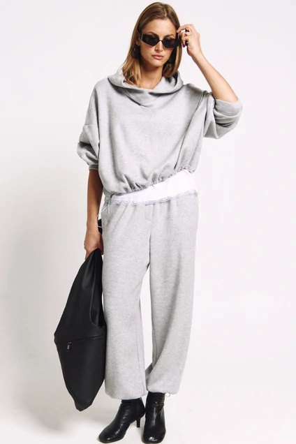 Комплект - худи и джоггеры. Худи большого объема с необычным капюшоном-стокой. Ширина низа худи регулируется резинками. Джоггеры из мягкого трикотажа, в классическом сером. Джоггеры умеренного объема. По низу ширина регулируется металлизированной резинкой и фиксаторами.