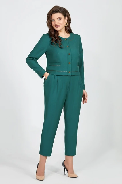Стильный, женский костюм полу-прилегающего силуэта, выполнен из текстиля, на подкладке. Костюм состоит из жакета и брюк. Жакет на подкладке, с застежкой на планку с пуговицами, горловина округлой формы, с обтачкой декорированной кантом. На полочке обработаны прорезные карманы с листочкой, по низу жакет с планкой, все декорировано кантом. Спинка со средним швом и вытачками, рукав втачной, оптимальной длины, по низу на манжете с кантом. Брюки заужены к низу, верхний срез обработан притачным поясом, застежка по переду на молнию и пуговицу. По переду брюк обработаны складки, в боковых швах карманы. Эффектный костюм классического покроя прекрасный выбор для вашего гардероба. Длина жакета 47см, длина брюк по боковому шву 90см, длина брюк по внутреннему шву 65см в 52р. Блуза: ширина груди 54см, ширина талии 52см, длина рукава 59см, ширина рукава 19,5см