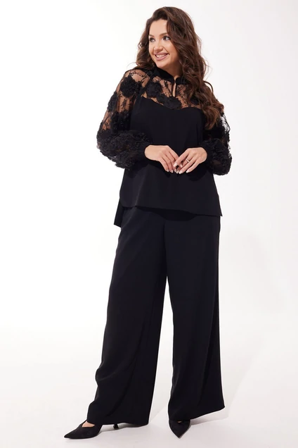 Костюм женский свободного силуэта состоит из блузы и брюк. Блуза, комбинированная из двух различных по фактуре тканей. По горловине застежка на крючек. Боковые швы заканчиваются небольшими разрезами. Воротник стойка. Рукава реглан, низ на резинке. Брюки палаццо, на притачном поясе с резинкой и тесьмой. У брюк - боковые карманы.
