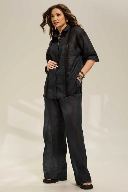 Костюм женский, состоит из блузы и брюк. Блуза прямого силуэта. Воротник стоячий отложной, застежка центрально-бортовая потайная, на петли-пуговицы. В подрезах полочек , спинки и рукавх вставки: декоративная кружевная тесьма из хлопка. Рукав внизу на резинке, в боковых швах блузы - разрезы. Брюки на резинке, свободные, прямые, с боковыми карманами. Подкладка вискозная - с шортиками.