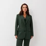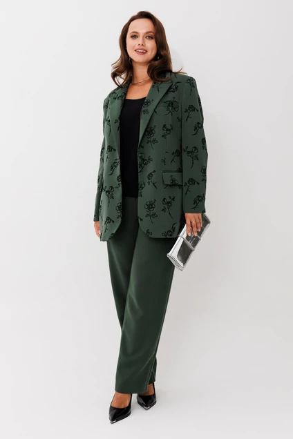 Элегантный женский костюм, состоящий из жакета и прямых брюк, выполнен из костюмной ткани с флоковым напылением — материал стабилизирован, не растягивается и отлично держит форму. Жакет однобортный, на петлях и пуговицах, с английским воротником и клапанами по бокам. Рукав втачной, длина — полная. Посадка свободная, что обеспечивает комфорт и стильный силуэт. Брюки прямого кроя, на частичной резинке по поясу для удобной посадки и идеального прилегания.