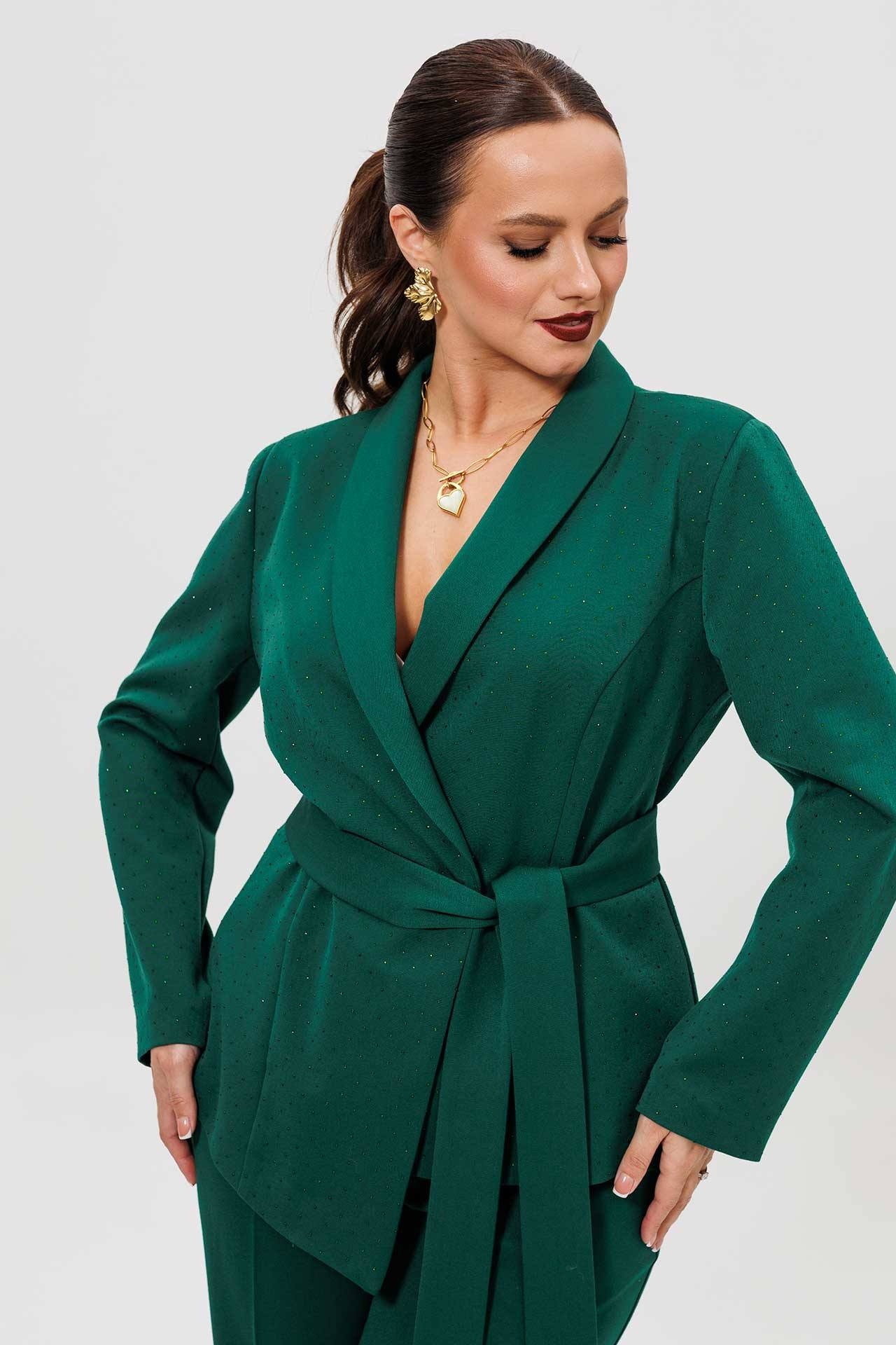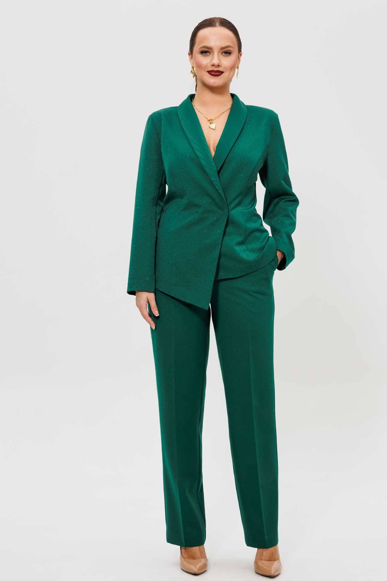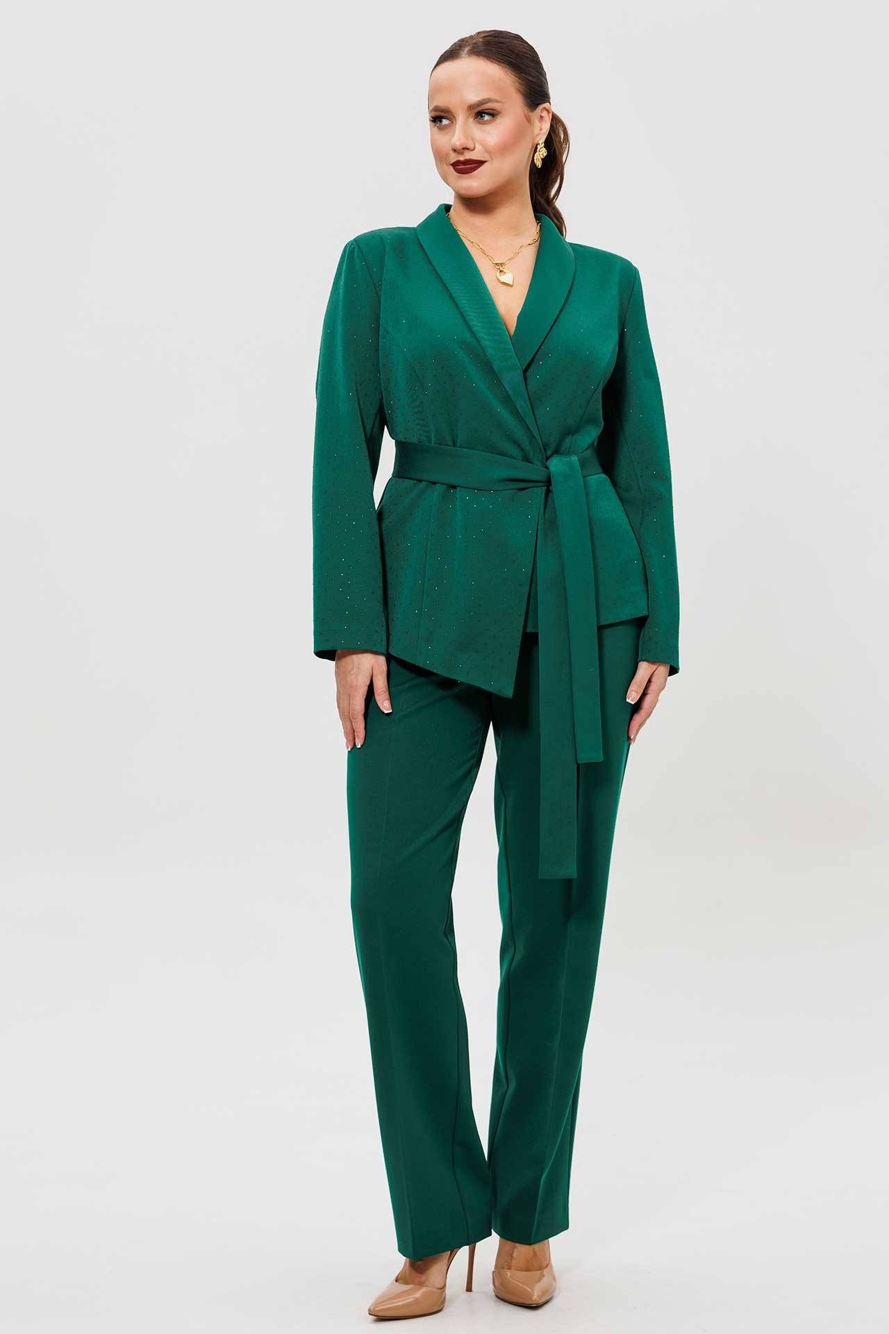Элегантный женский костюм из зеленой костюмной ткани — идеальный выбор для тех, кто ценит комфорт и стиль в повседневной жизни. Женский брючный костюм, состоящий из жакета и брюк. Жакет полуприлегающего силуэта, двубортный, с застежкой на две кнопки. Воротник английский. Рукав втачной. По бокам рельефные швы, формирующие силуэт. На уровне груди предусмотрены нагрудные вытачки. Брюки прямого силуэта, слегка зауженные к низу. Пояс частично на резинке (по бокам), с шлевками для ремня. Застежка на гульфик с молнией и внутренним крючком. По бокам боковые карманы с косым входом. Материал костюма костюмный, средней плотности, ткань жакета украшена мелкими стразами в тон костюма, ткань брюк с гладкой фактурой. Без подкладки. Дополняет модель широкий пояс Этот костюм станет отличным дополнением к вашему гардеробу, позволяя создавать модные и стильные образы каждый день.