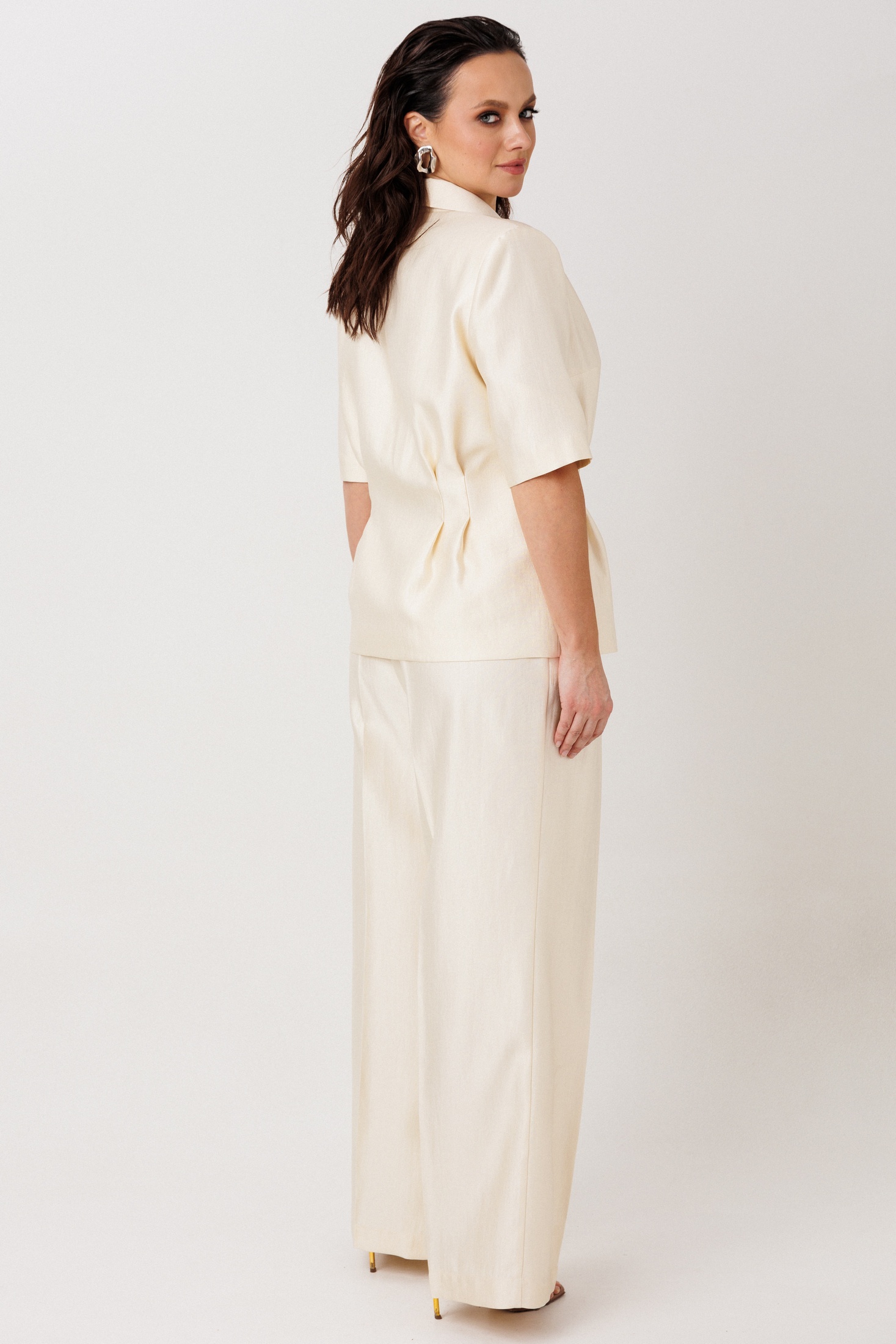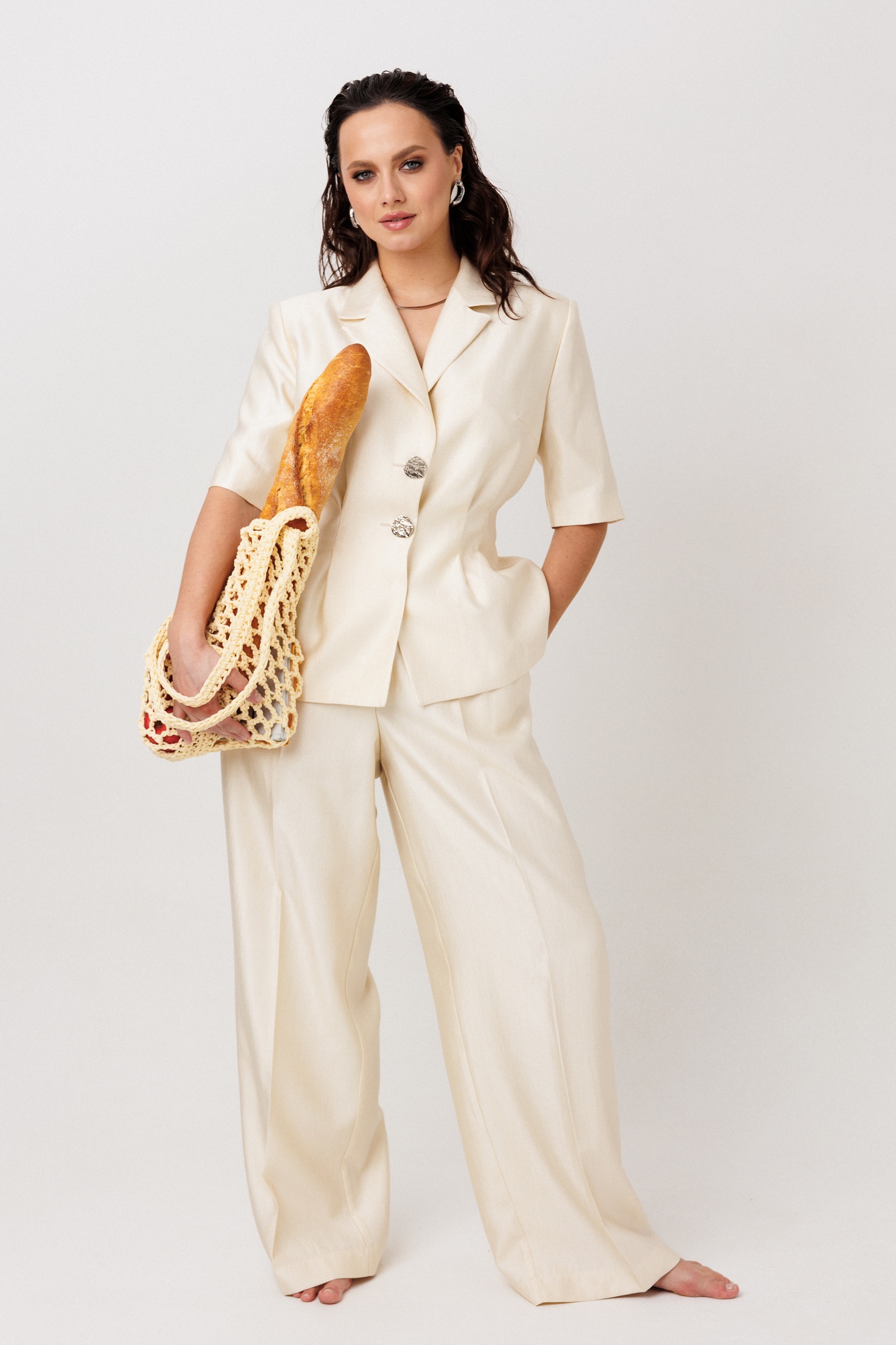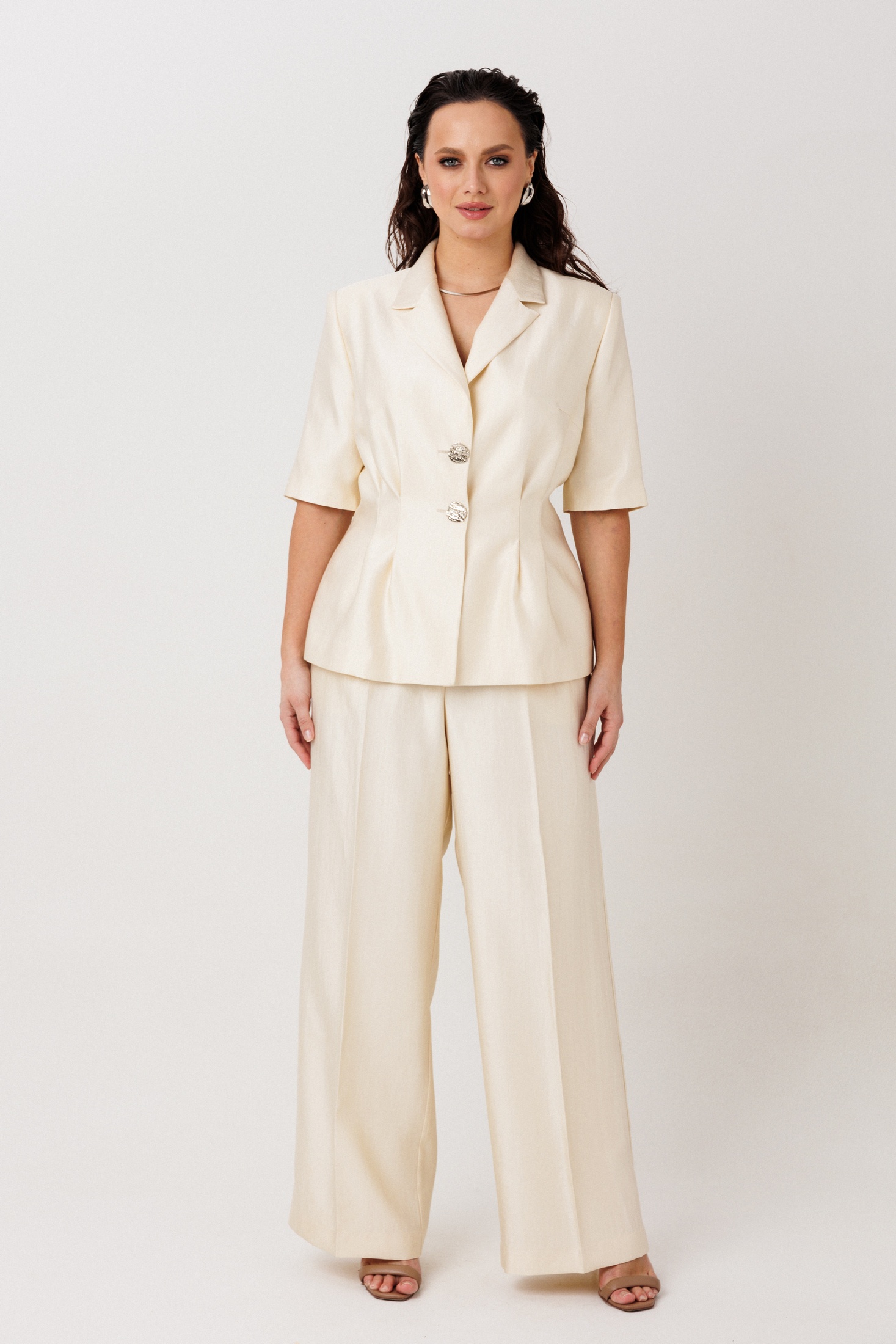 Костюм брючный 1294 MisLana сочетает в себе классические элементы и современный стиль. Коллекция бренда MisLana предлагает этот изысканный брючный костюм-двойку, выполненный из сатиновой ткани с легким сиянием, который добавляет легкости и утонченности. Жакет с приталенным силуэтом и V-образным вырезом застегивается на декоративные пуговицы, что акцентирует талию и подчеркивает строгость силуэта. Короткие рукава обеспечивают комфорт и функциональность. Брюки с высокой посадкой и прямым кроем удлиняют фигуру, подтверждая актуальность образа. Это идеальный выбор для деловых встреч или официальных мероприятий в прохладное время года. Кремовый цвет костюма дополнит ваш гардероб универсальностью и статусом.
