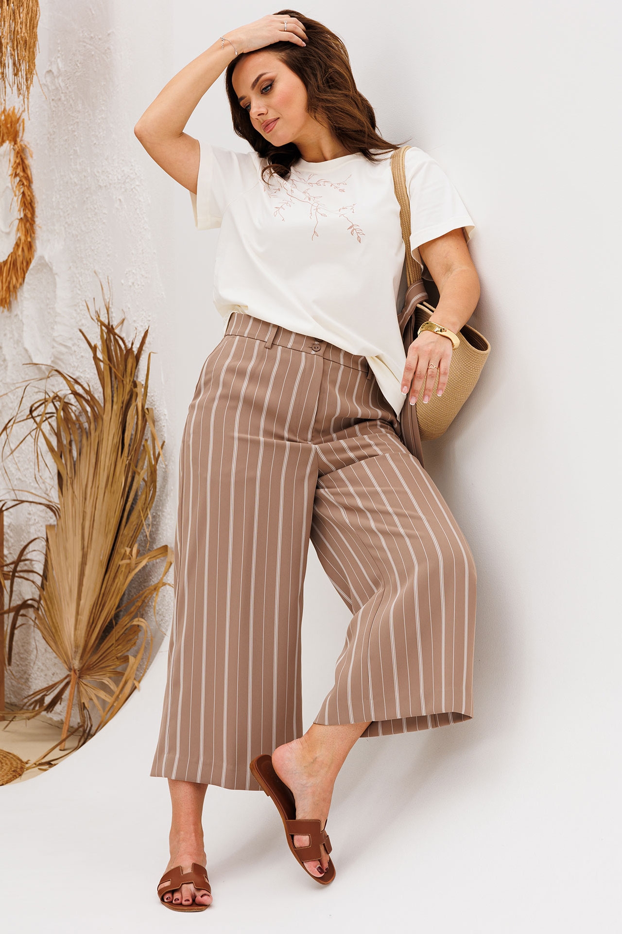 Комплект женский состоит из блузы и брюк. Блуза свободного силуэта выполнена из тонкого трикотажного полотна. Горловина круглая. Рукава одно шовные втачные. Украшением служит декоративная печать. Брюки широкие прямые с высокой посадкой(кюлоты) до середины голени. Брюки на притачном поясе с функциональными боковыми карманами и застёжкой на потайную молнию с гульфиком и откоском. По спинке талевые вытачки. Дополнением служит пояс.