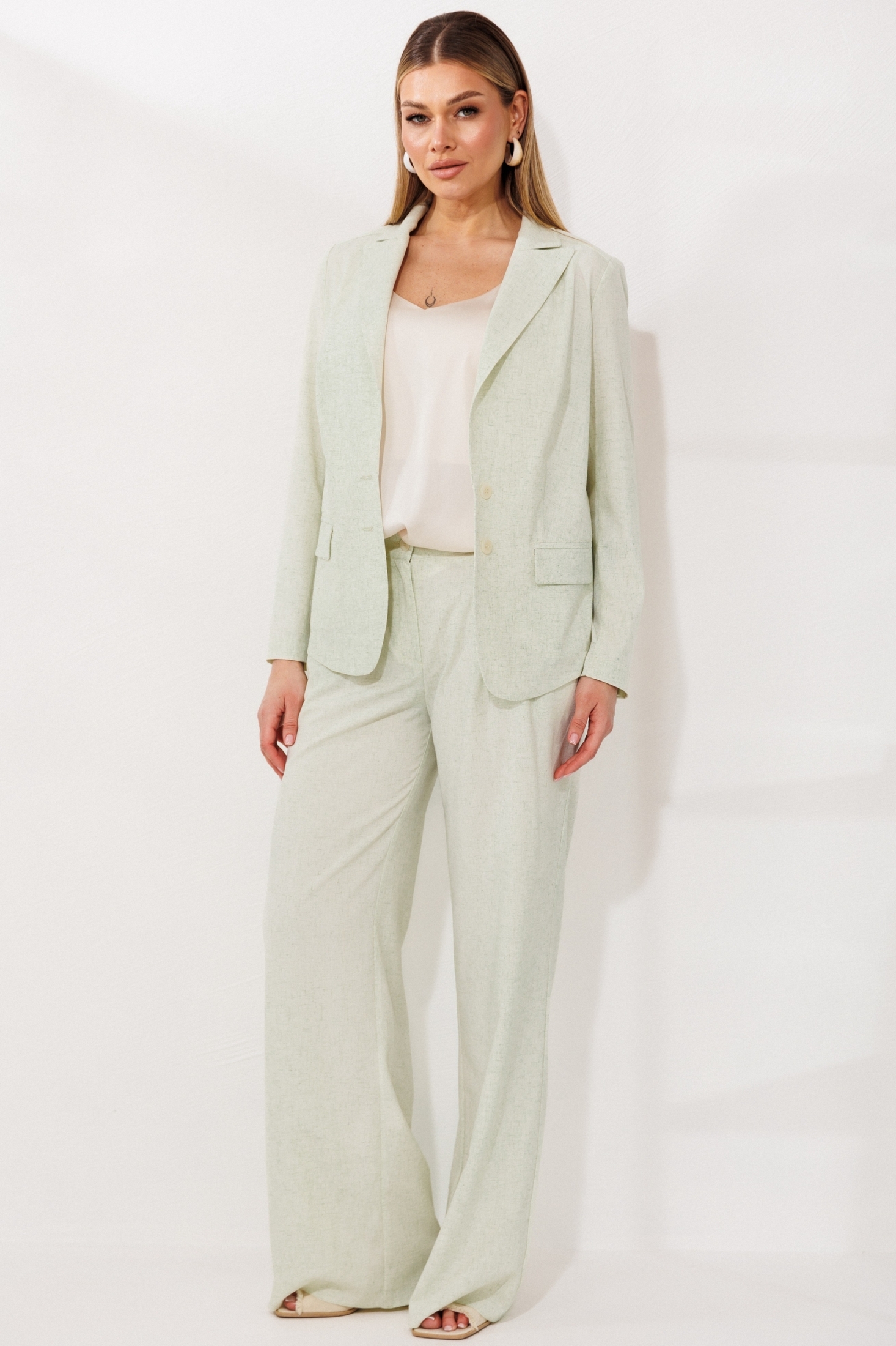 Костюм брючный 26-2924 салатовый Мода-Юрс — это стильный выбор для вашего гардероба. Коллекция бренда Мода-Юрс предлагает легкий костюм из натуральной ткани, состоящий из жакета и брюк палаццо. Жакет классического кроя с изящными талиевыми вытачками и воротником пиджачного типа подчеркнет вашу фигуру. Карманы с клапанами и застежка на пуговицы добавляют практичности и нотку классики. Брюки палаццо с притачным поясом и застежкой на молнию обеспечивают комфортное ношение и легкость движений. Костюм выполнен в освежающем салатовом цвете, подходящем для весенне-летнего сезона. Длина жакета составляет 64 см, а длина брюк — 113 см. Этот костюм идеально подойдет для вечерних мероприятий, подчеркивая ваше чувство стиля.
