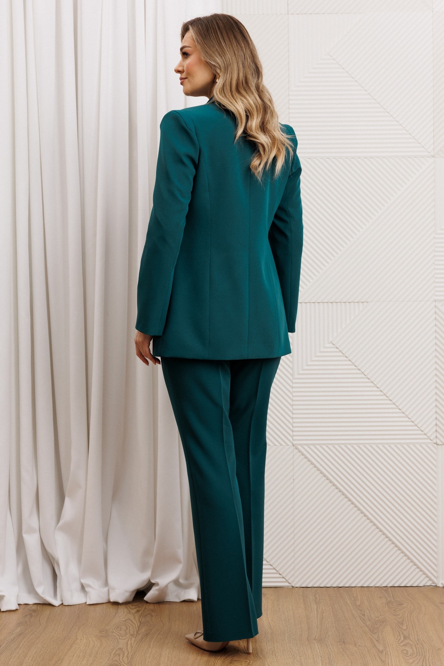 Деловой комплект, состоящий из жакета и брюк. Жакет - воплощение стильной трансформации. Его классический крой выполнен из безупречной костюмной ткани, но в деталях скрывается своенравный характер. Жакет полуприлегающего силуэта. Модель отличается аккуратным кроем и стильными деталями. На передней части жакета обработаны вертикальные рельефы, идущие от проймы до уровня кармана и от кармана до низа, что придаёт силуэту выразительность и стройность. Воротник пиджачного типа добавляет классической элегантности. Застёжка центральная бортовая на петлю-пуговицу. Карманы в рамке с клапанами, гармонично расположены на передней части жакета. Спинка с центральным швом и вертикальными рельефами, идущими от проймы. Рукава двухшовные с отрезной деталью по окату и разрезами внизу добавляют свободы движению и делают модель более интересной. Жакет на подкладке. Брюки с высокой посадкой, по линии талии – притачной пояс, в боковых швах резинка. Застежка на молнию.